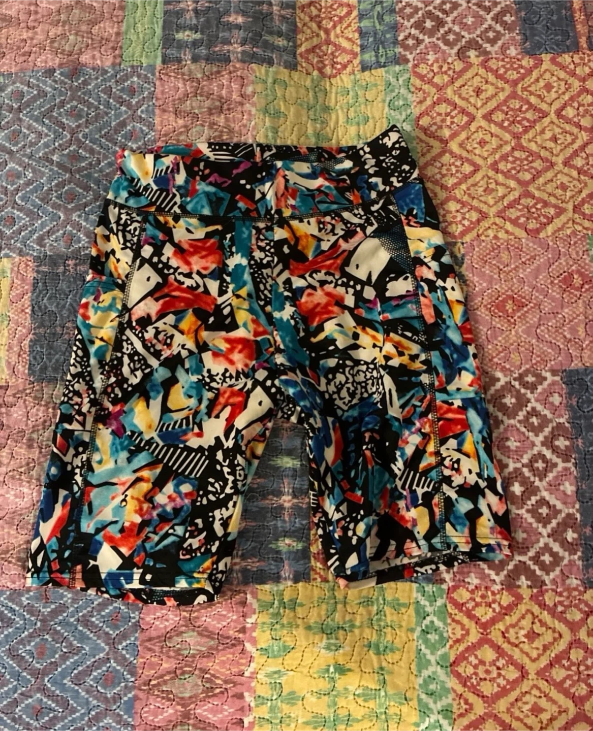 These athletic bike shorts feature a vibrant, abstract multicolor print. They're designed with a comfortable stretch fabric and include pockets. Perfect for workouts or casual wear!