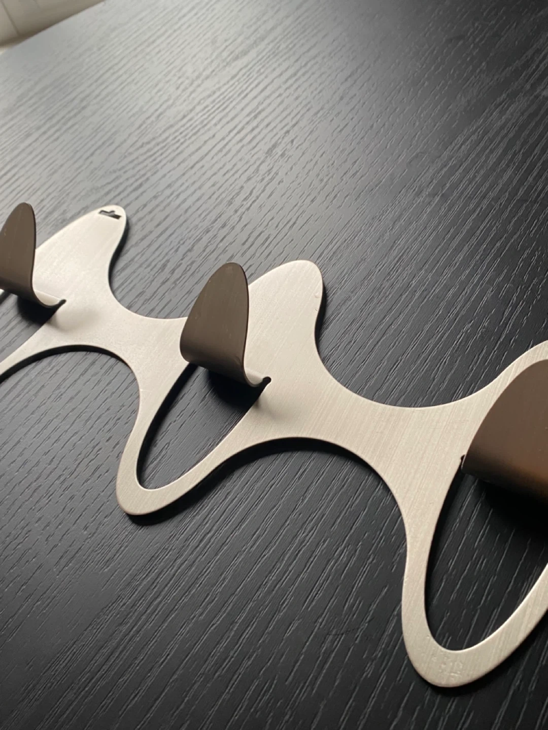 The design is intended to be both functional and sculptural; when nothing is hanging on it, it looks like a piece of abstract wall art.