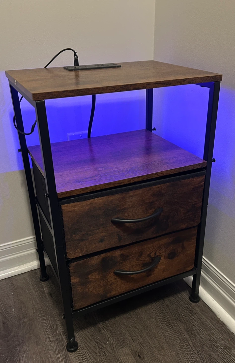These nightstands feature a rustic wood finish and a metal frame. They come with two drawers for storage and integrated LED lighting. USB ports included for charging phones