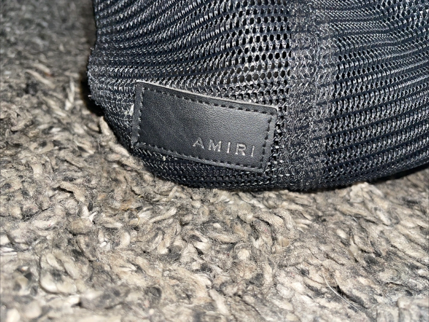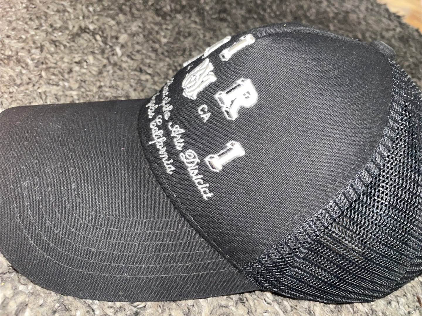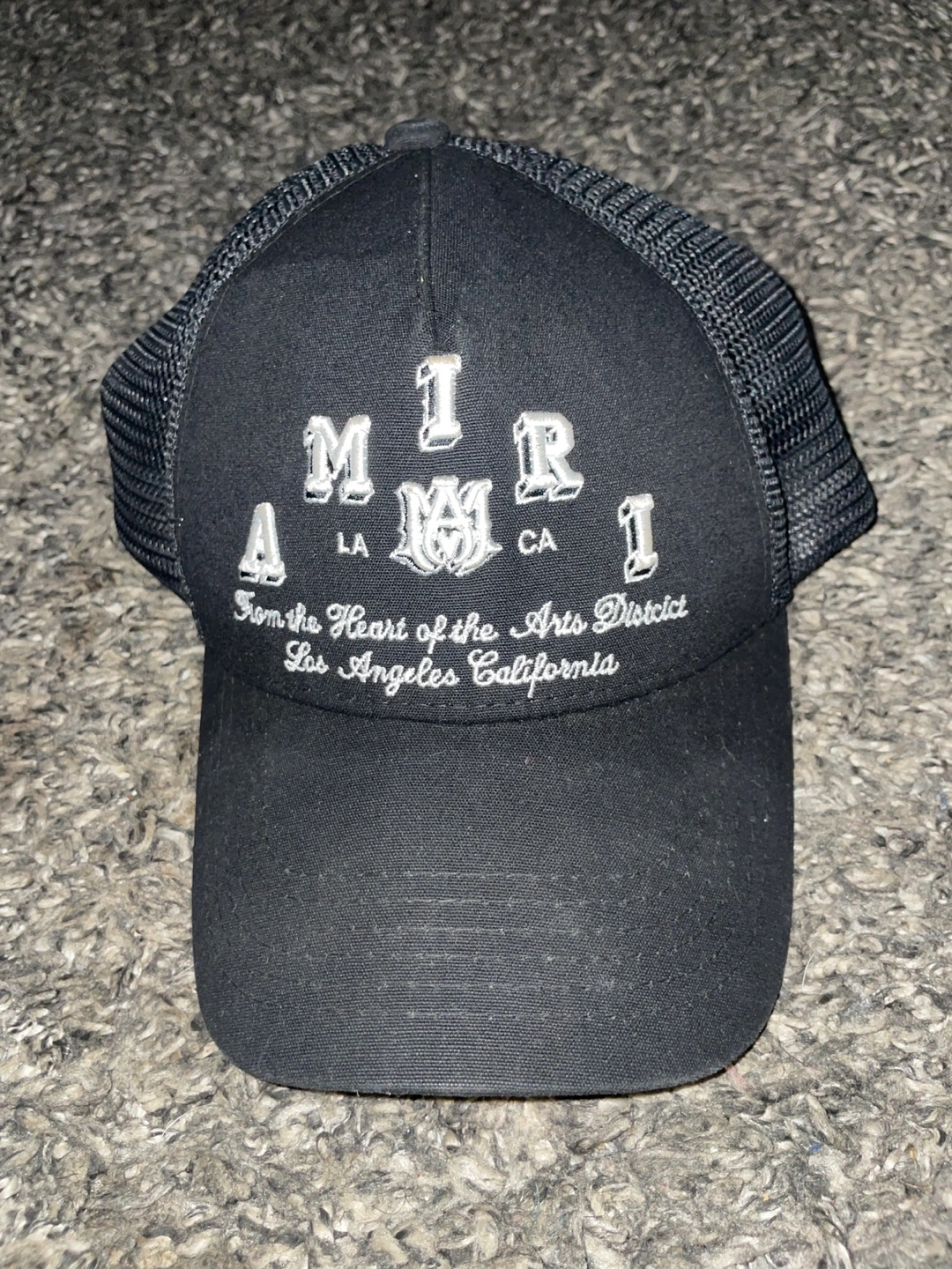 Selling a black Amiri trucker hat. It's in great condition and ready for a new owner! The hat features the Amiri logo and the text 'From the Heart of the Arts District Los Angeles California'.