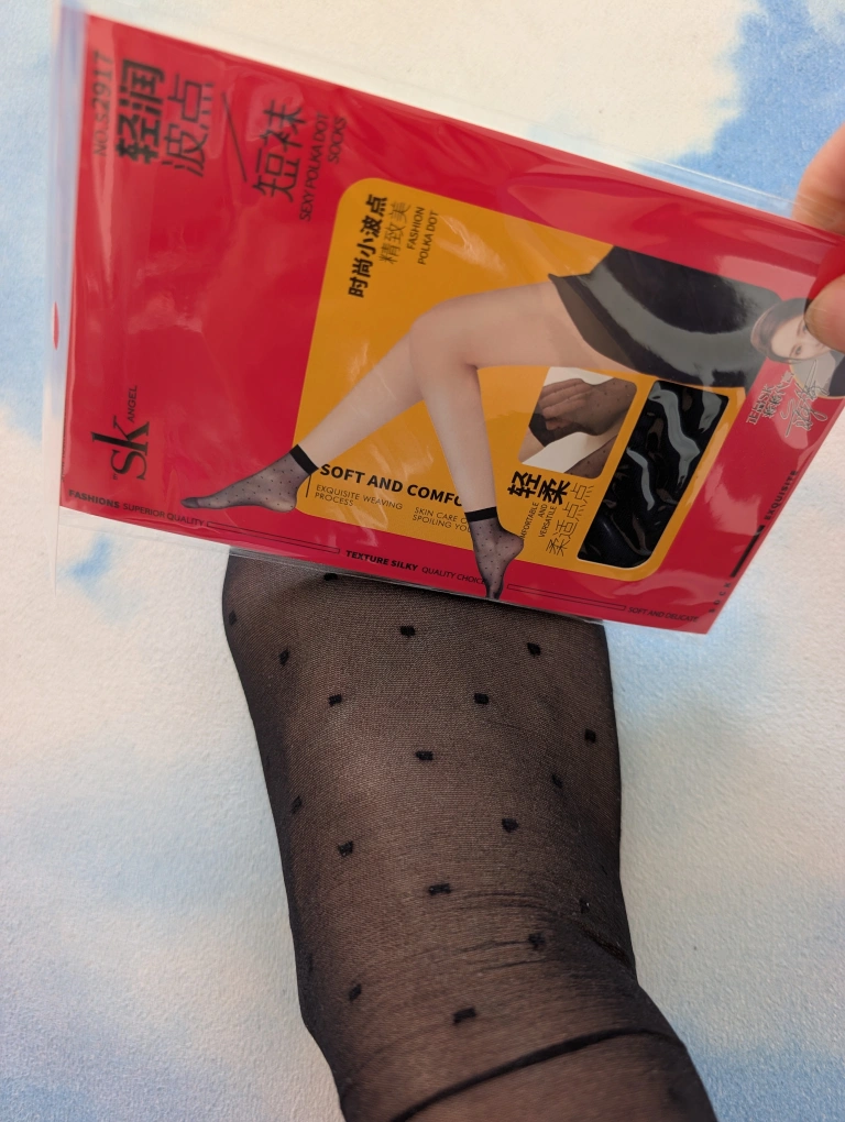 These are soft and comfy with a silky texture. Light and see through with cute tiny poka dots. Great to pair with any shoes.