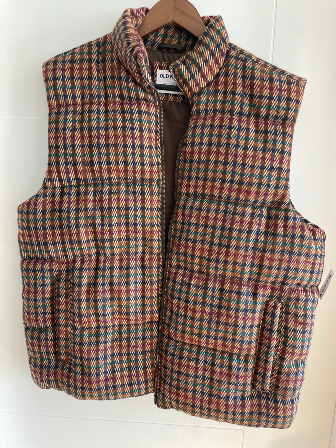Old Navy men’s/unisex puffer vest in a fun houndstooth pattern! It's a great layering piece for fall and winter. The vest is in excellent condition (never worn) and has a full zip closure. It's made of a soft, comfortable material that will keep you warm.