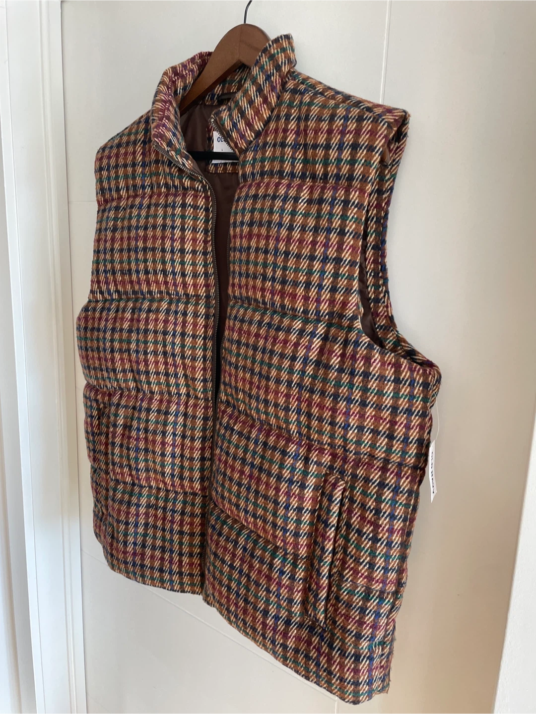 Old Navy men’s/unisex puffer vest in a fun houndstooth pattern! It's a great layering piece for fall and winter. The vest is in excellent condition (never worn) and has a full zip closure. It's made of a soft, comfortable material that will keep you warm.
