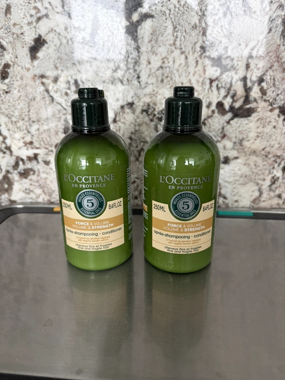 Two bottles of L'Occitane Force & Volume conditioner, each 250ml. Formulated with essential oils and vegetal keratin extract. Designed for fine and fragile hair. $30 each or both for $55