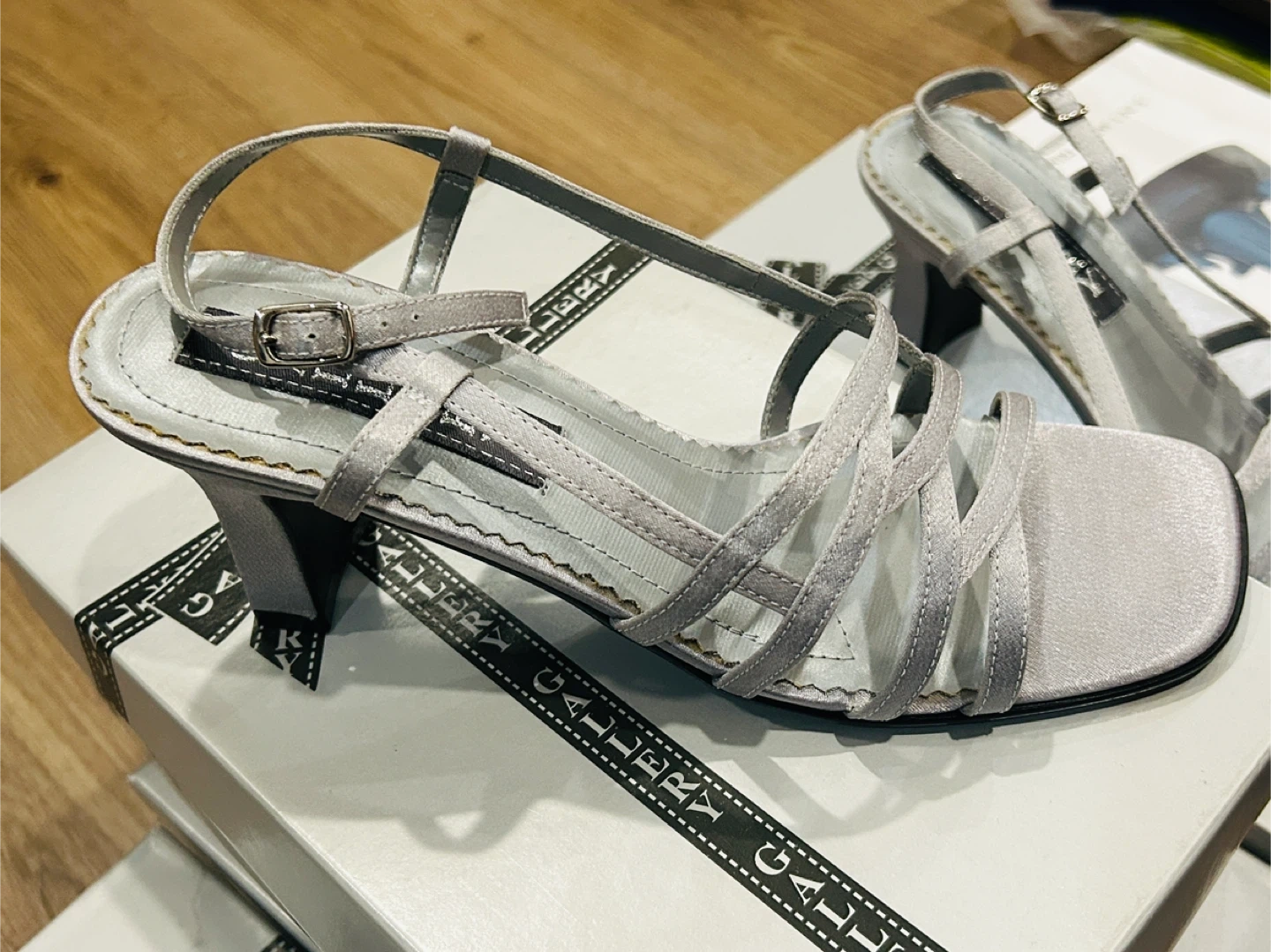 Elegant strappy heeled sandals in a silver satin material. These feature a buckle ankle strap and a comfortable block heel. Perfect for dressing up any outfit!