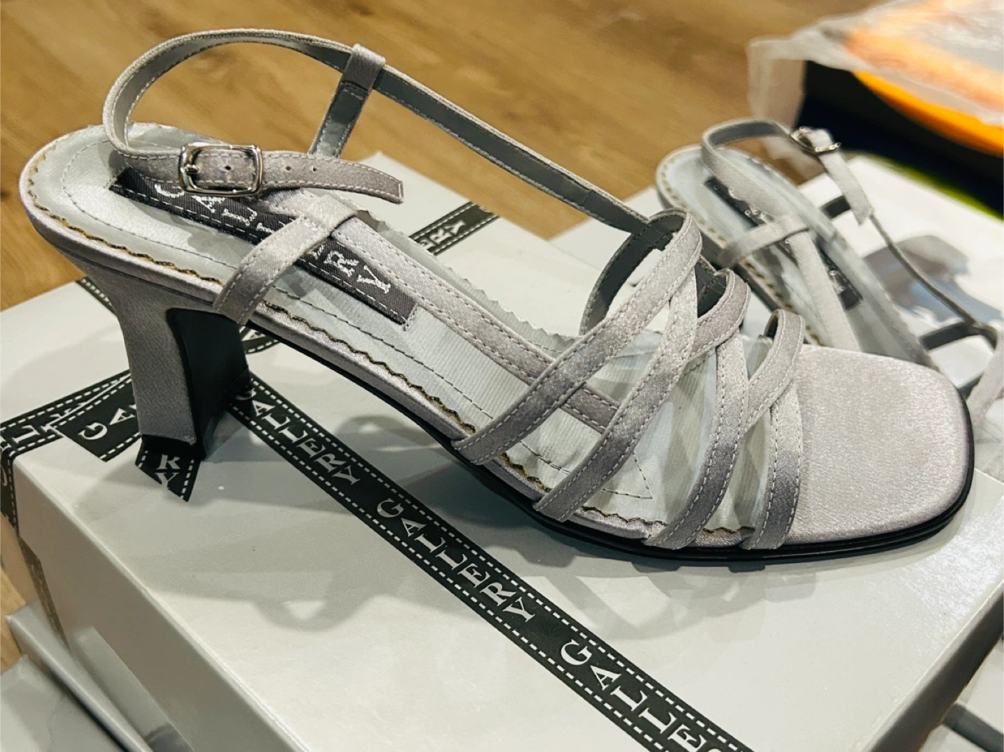 Elegant strappy heeled sandals in a silver satin material. These feature a buckle ankle strap and a comfortable block heel. Perfect for dressing up any outfit!