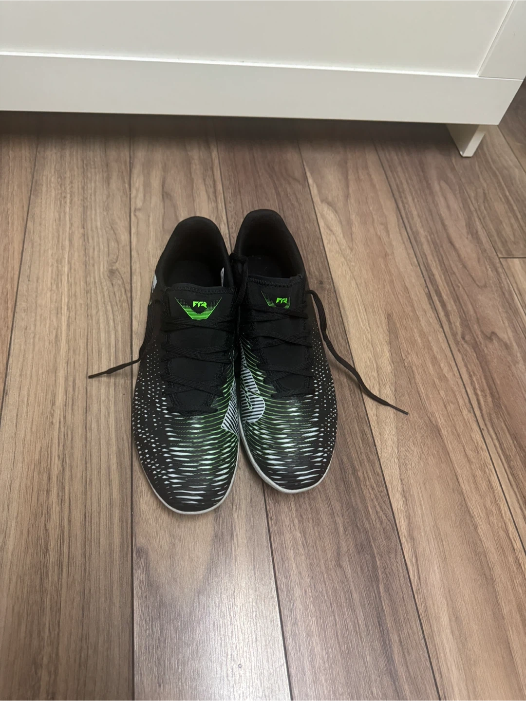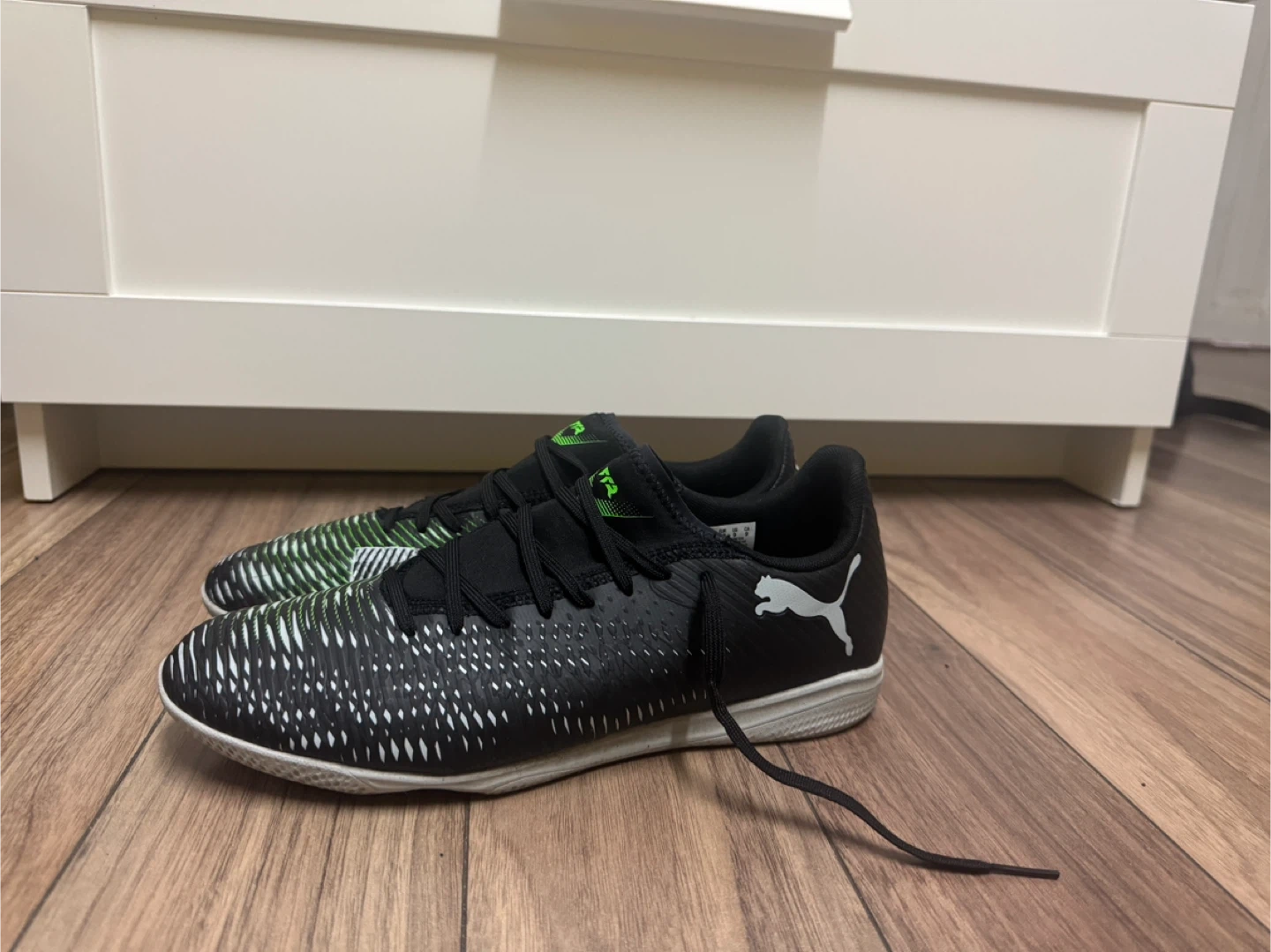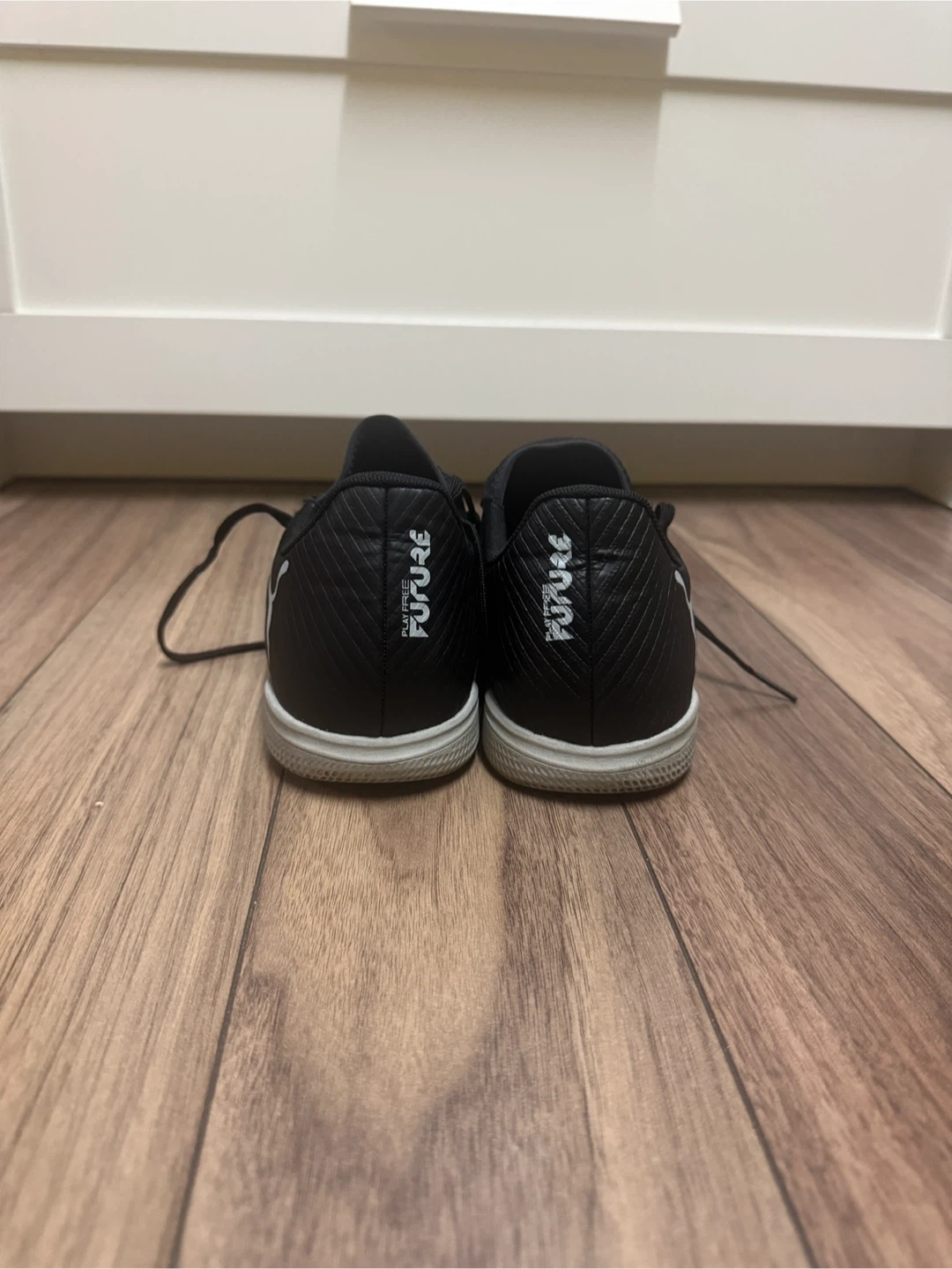 Selling a pair of Puma Future Play indoor soccer shoes! These are in great condition and ready for a new player. They feature a sleek black and white design with the Puma logo. Perfect for indoor soccer or futsal games