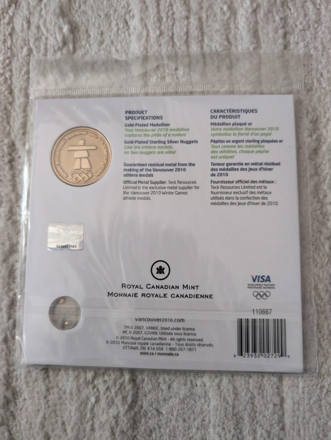 This is a gold-plated medallion celebrating the Vancouver 2010 Winter Olympics. It's made from guaranteed residual metal from the making of the Vancouver 2010 athlete medals. It features a gold-plated sterling silver nugget.