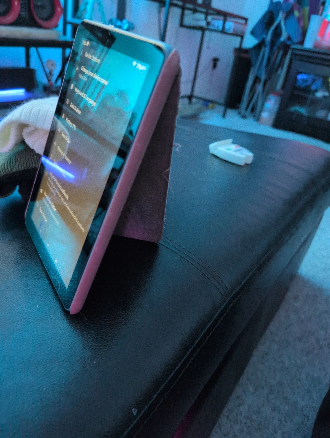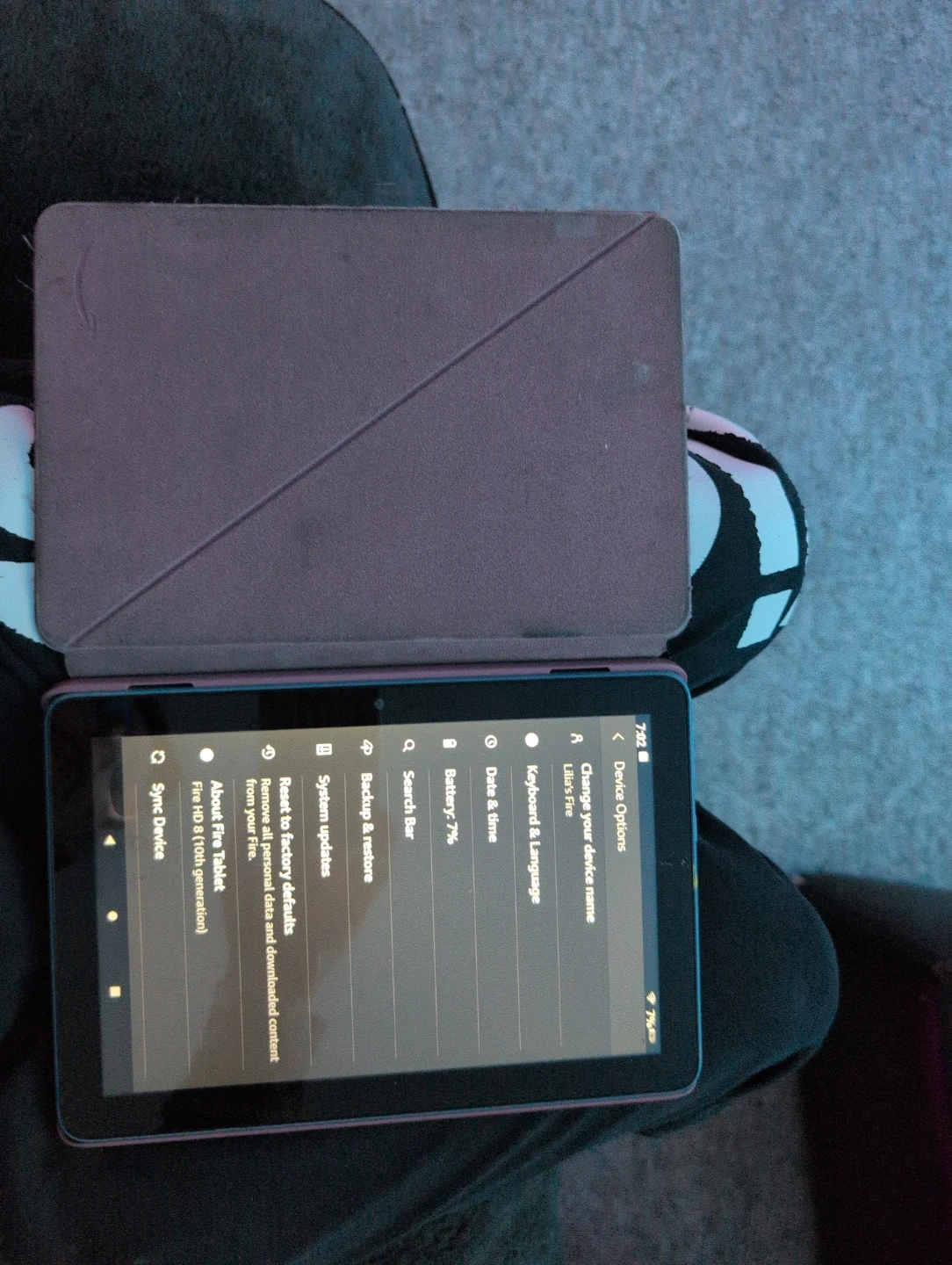 It's a light blue Amazon Fire tablet with a grey fabric case. The tablet is running Fire OS 7.3.3.1. It's the 10th generation model. Great for casual browsing and entertainment and great for kids as well!