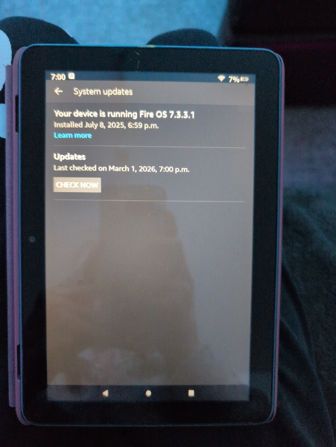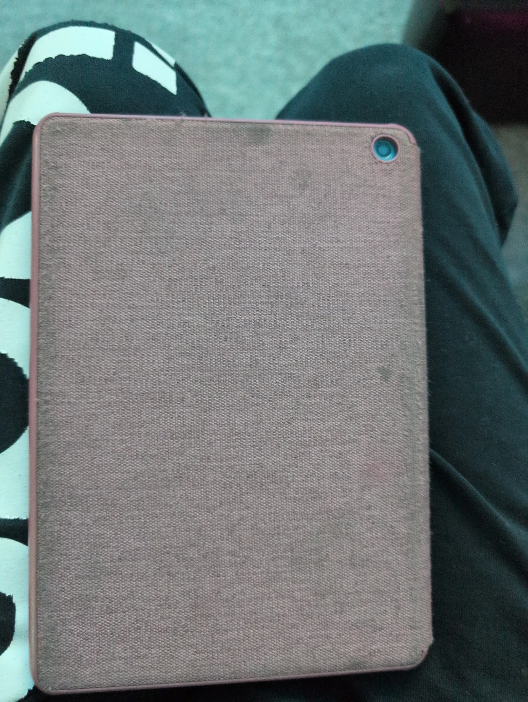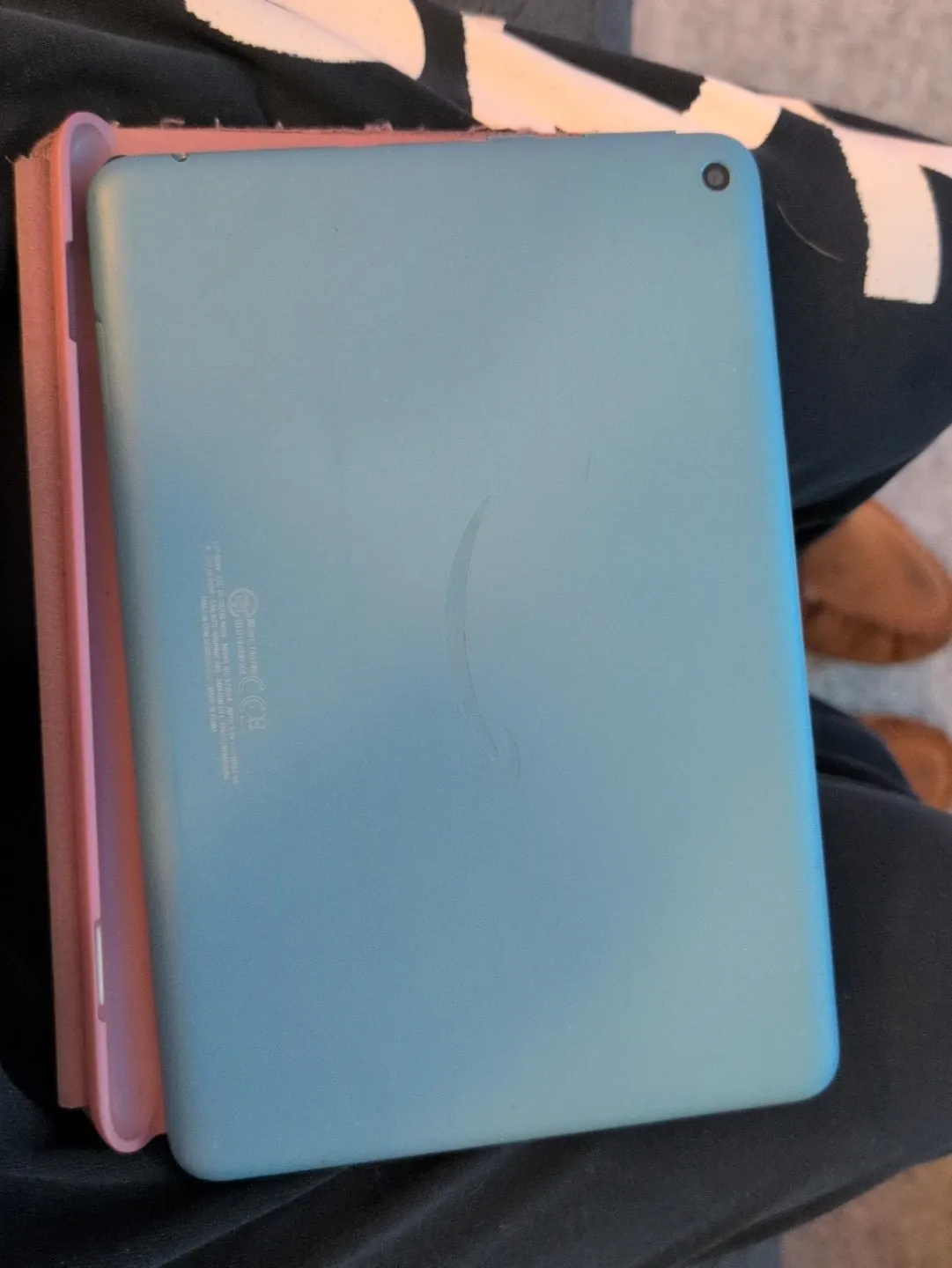 It's a light blue Amazon Fire tablet with a grey fabric case. The tablet is running Fire OS 7.3.3.1. It's the 10th generation model. Great for casual browsing and entertainment and great for kids as well!