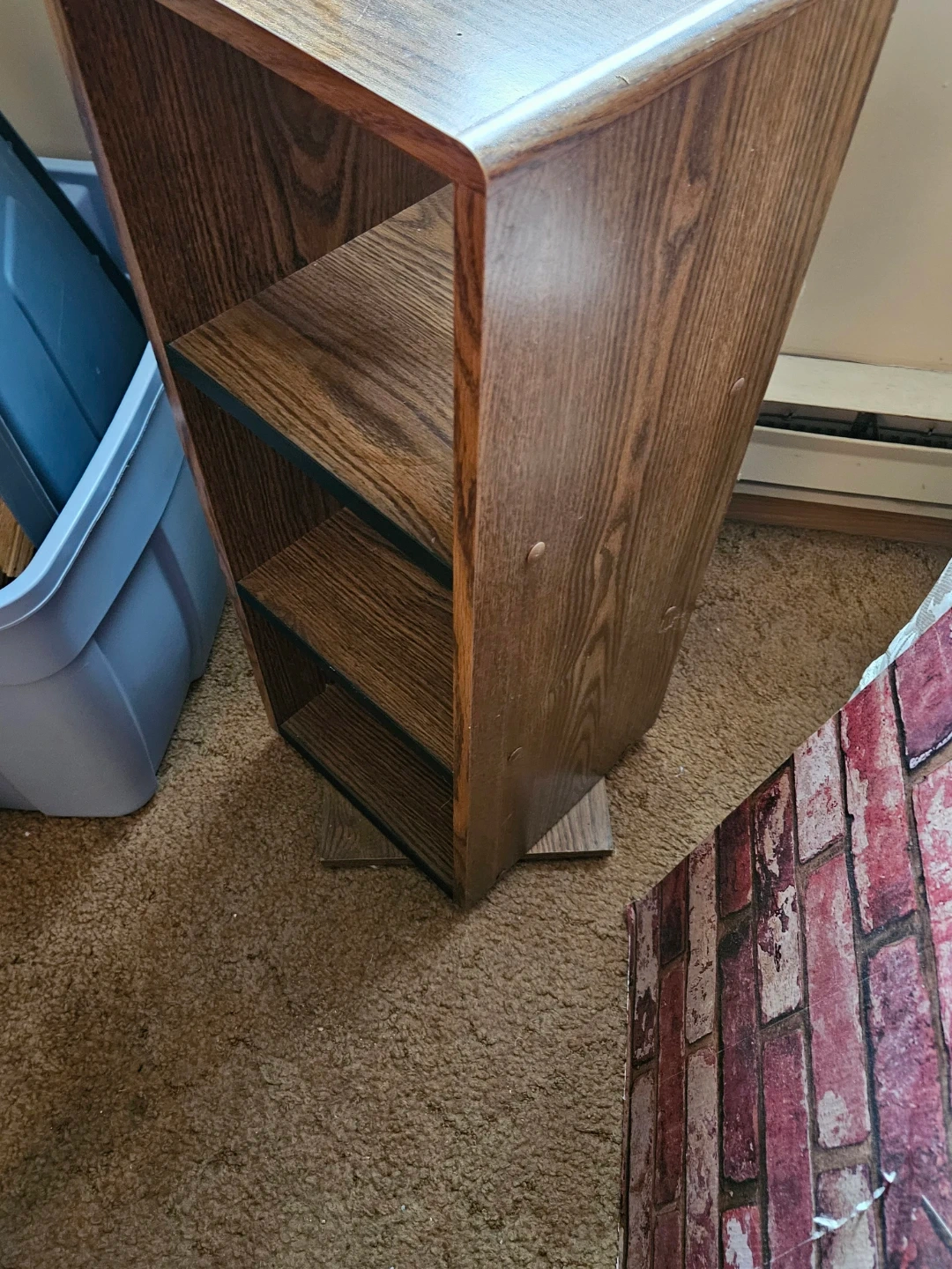 Here's a wooden shelf unit, perfect for displaying items or storing books. It has three shelves and a sturdy design. It's in good condition and ready for a new home!
