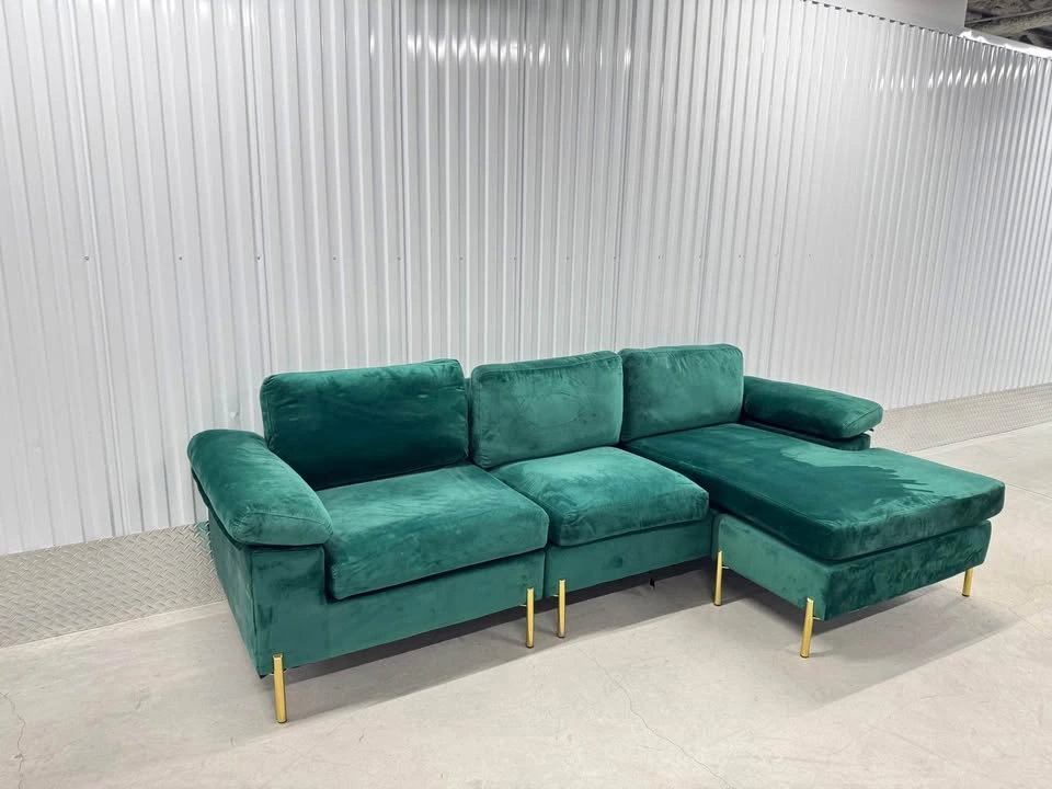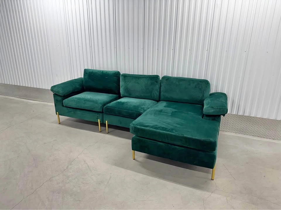 Beautiful Green Velvet Sofa sectional which can be either RIGHT or LEFT chaised.