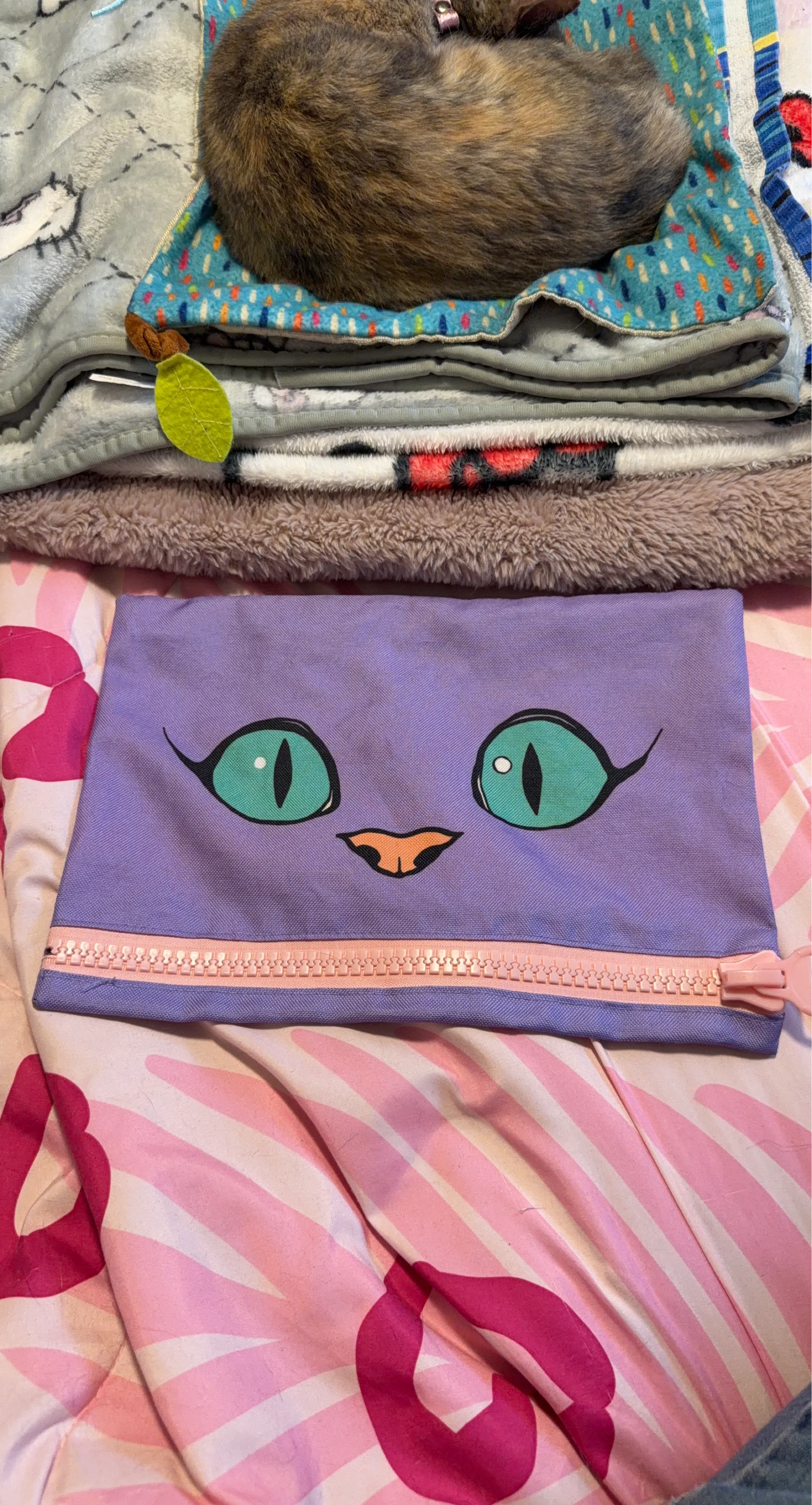 This is a cute purple zipper pouch with a fun cat face design. It's perfect for storing small essentials like makeup, pens, or coins! The zippered closure keeps your items secure.