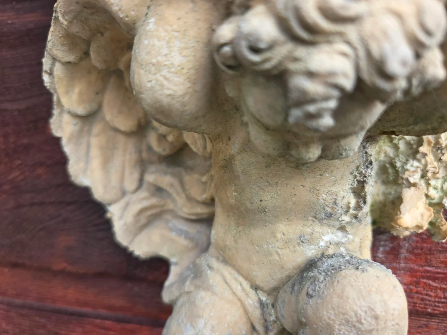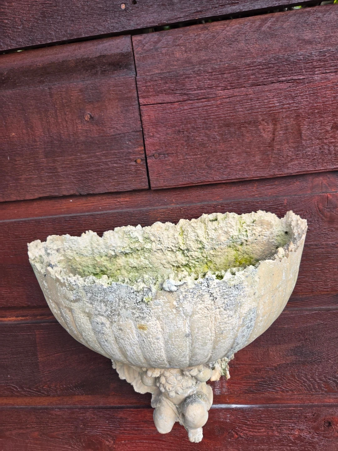 A charming stone wall planter featuring a cherub design. It's perfect for adding a touch of classical decor to your garden or patio. Material is stone.