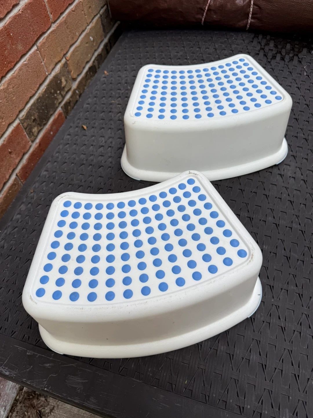 Two kids step stools for sale! They are white with blue dots on top. Great for helping little ones reach the sink or toilet. They are in good condition with some minor wear.