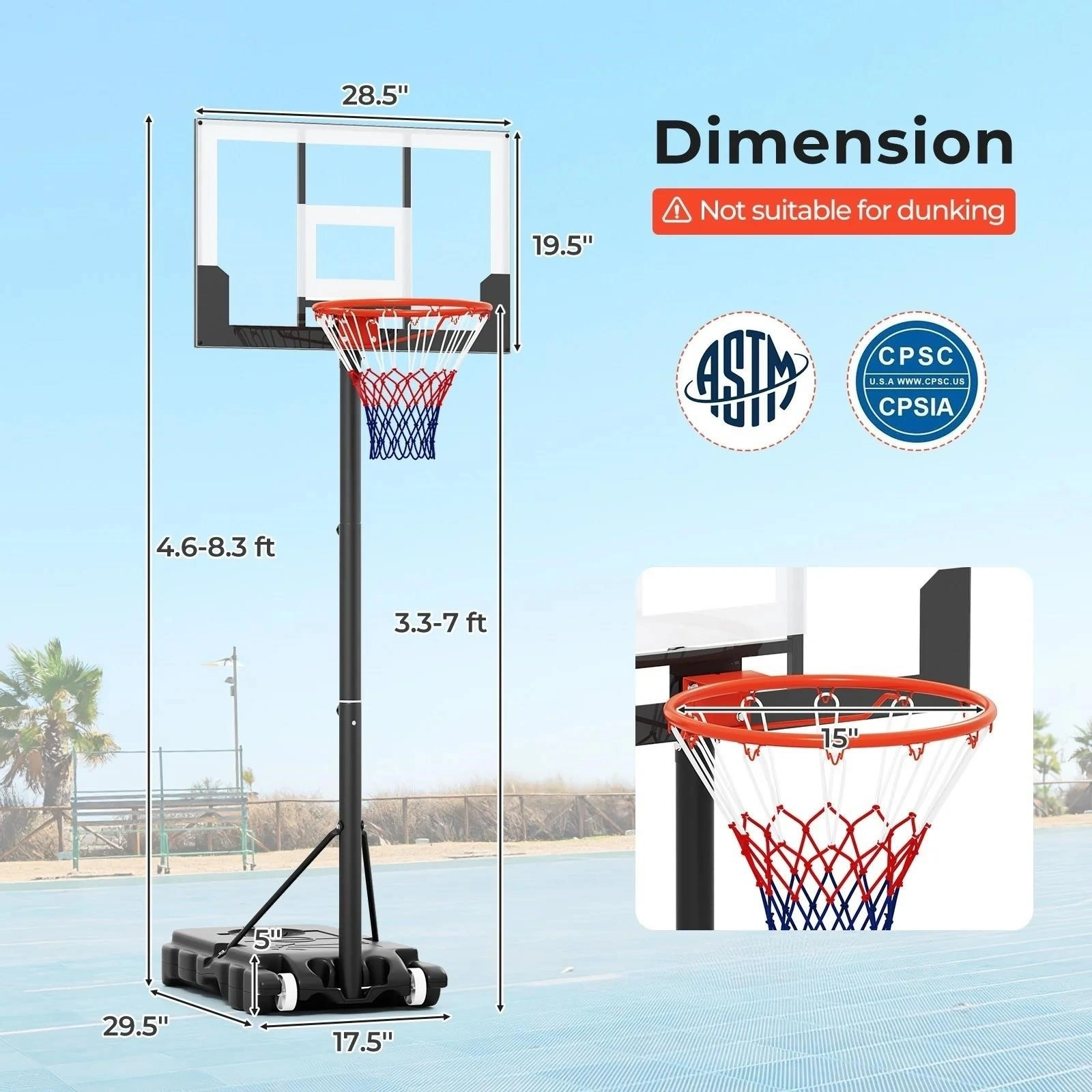 Brand New portable basketball stand system. The dimensions of the backboard are 28.5" x 19.5", and the height is adjustable from 4.6 to 8.3 feet. The base measures 29.5" x 17.5". The box is included!