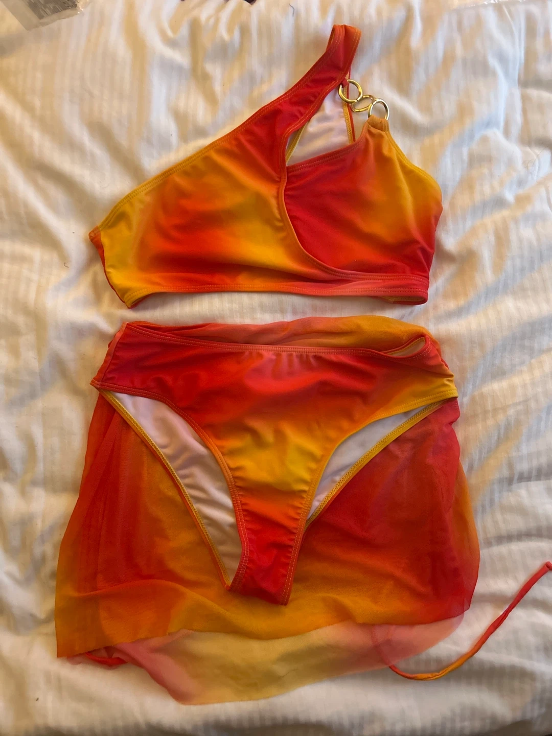 This three-piece swimsuit features a vibrant ombre pattern in shades of orange and yellow. It includes a one-shoulder bikini top, matching bottoms, and a sheer mesh skirt cover-up. The top has gold ring details.