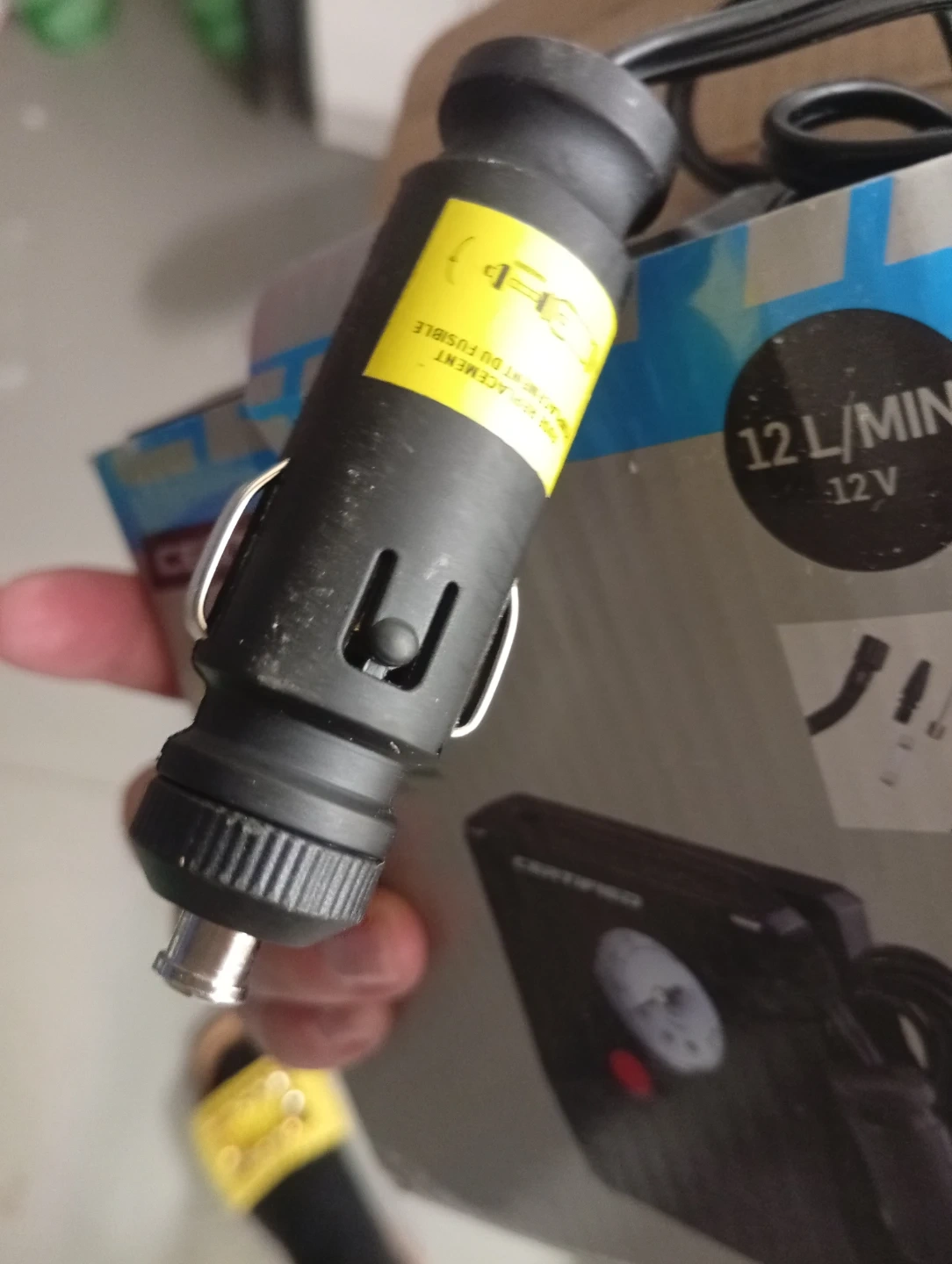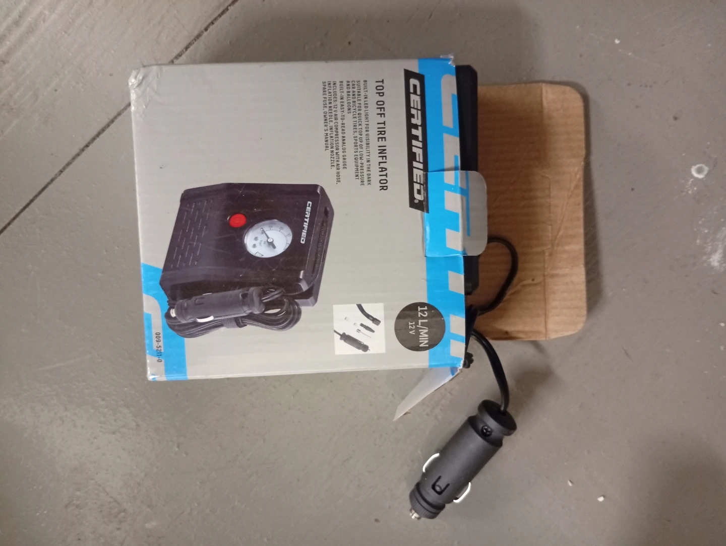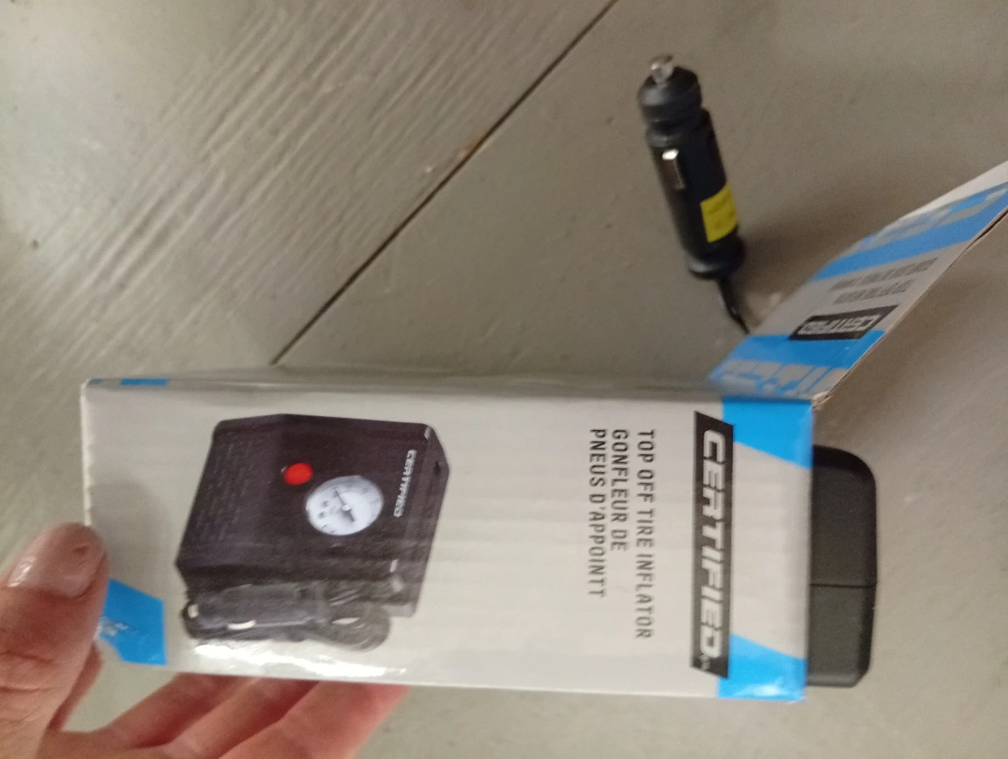 This Certified top off tire inflator is designed for convenience. It features a built-in pressure gauge and comes with necessary adapters for various inflation needs. Ideal for quick top-offs and emergency situations.