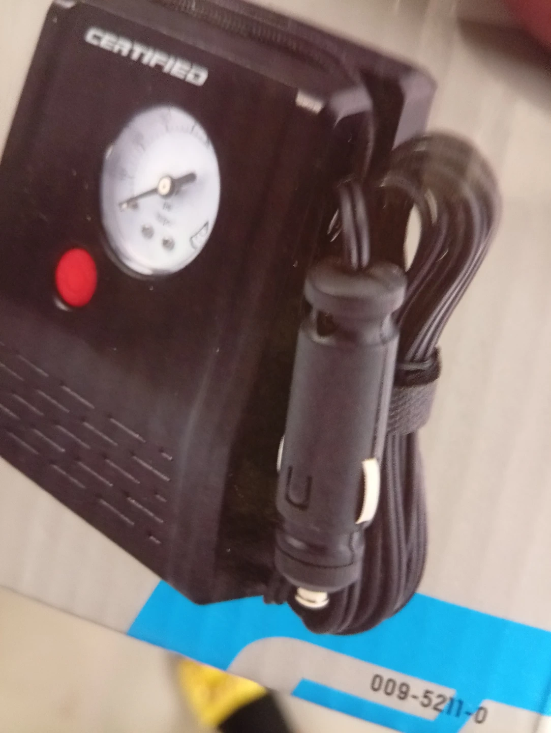 This Certified top off tire inflator is designed for convenience. It features a built-in pressure gauge and comes with necessary adapters for various inflation needs. Ideal for quick top-offs and emergency situations.