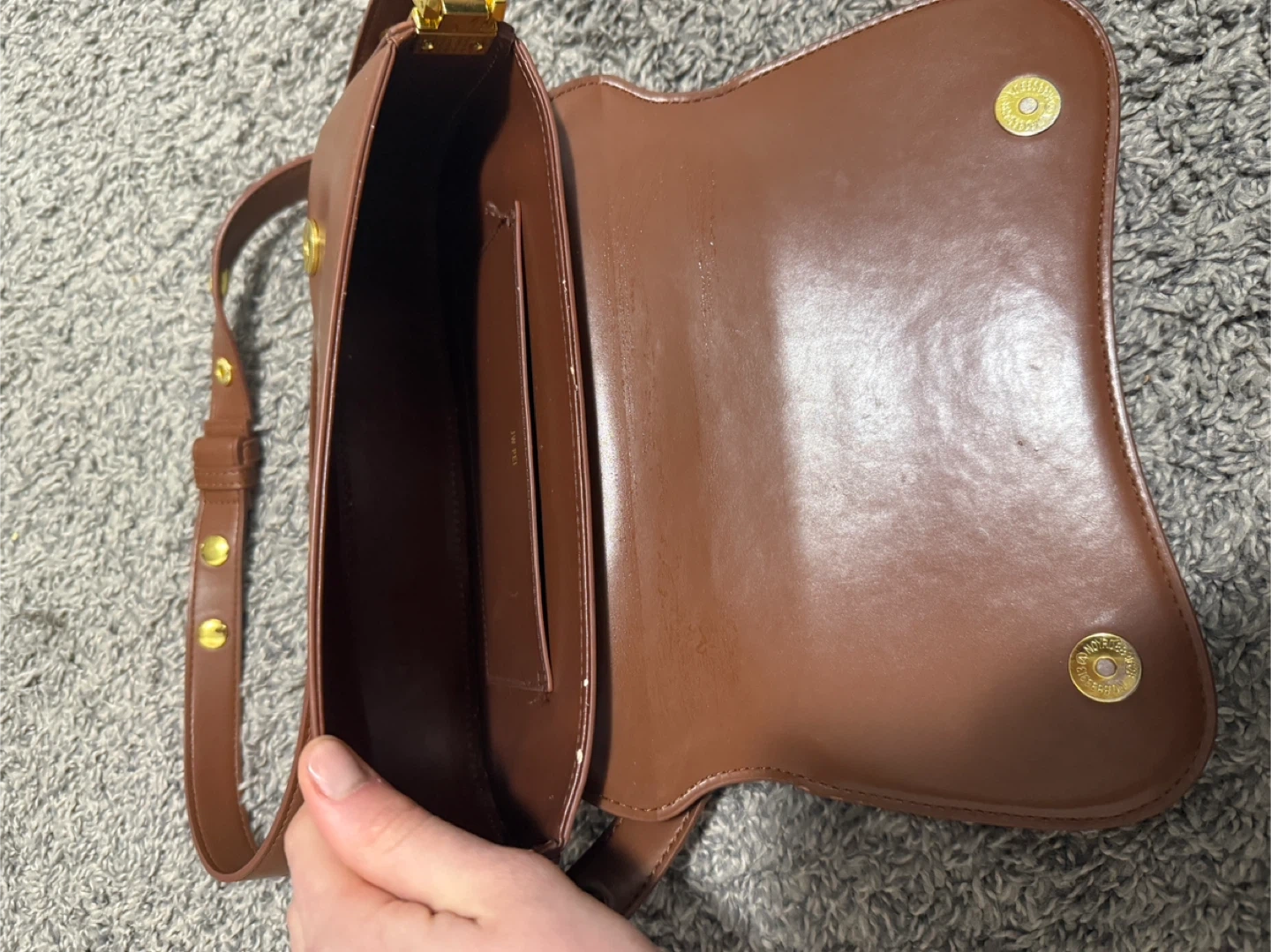 A stylish brown leather shoulder bag with a gold buckle closure. It's got an adjustable strap and a sleek, modern design. Interior includes a slip pocket for essentials.