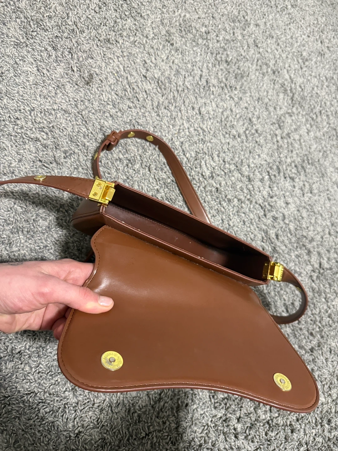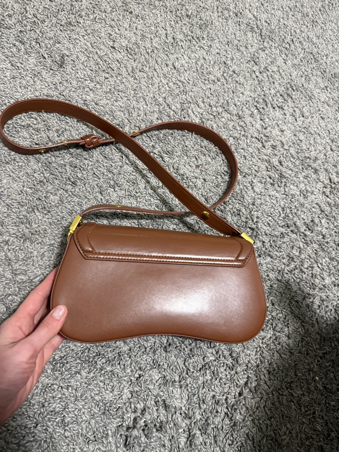A stylish brown leather shoulder bag with a gold buckle closure. It's got an adjustable strap and a sleek, modern design. Interior includes a slip pocket for essentials.