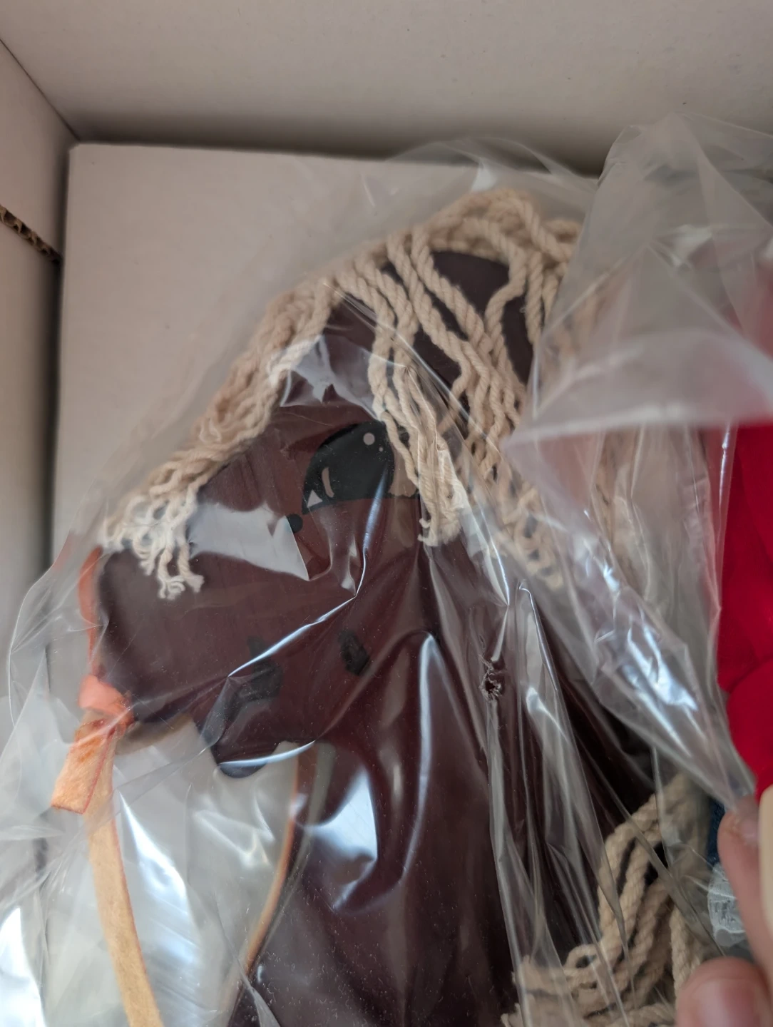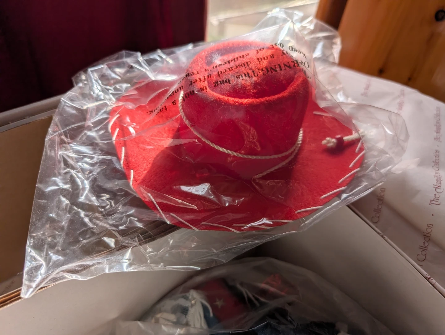 Dakota comes dressed in a cowgirl dress outfit with a red cowboy hat and sits on a rocking horse.