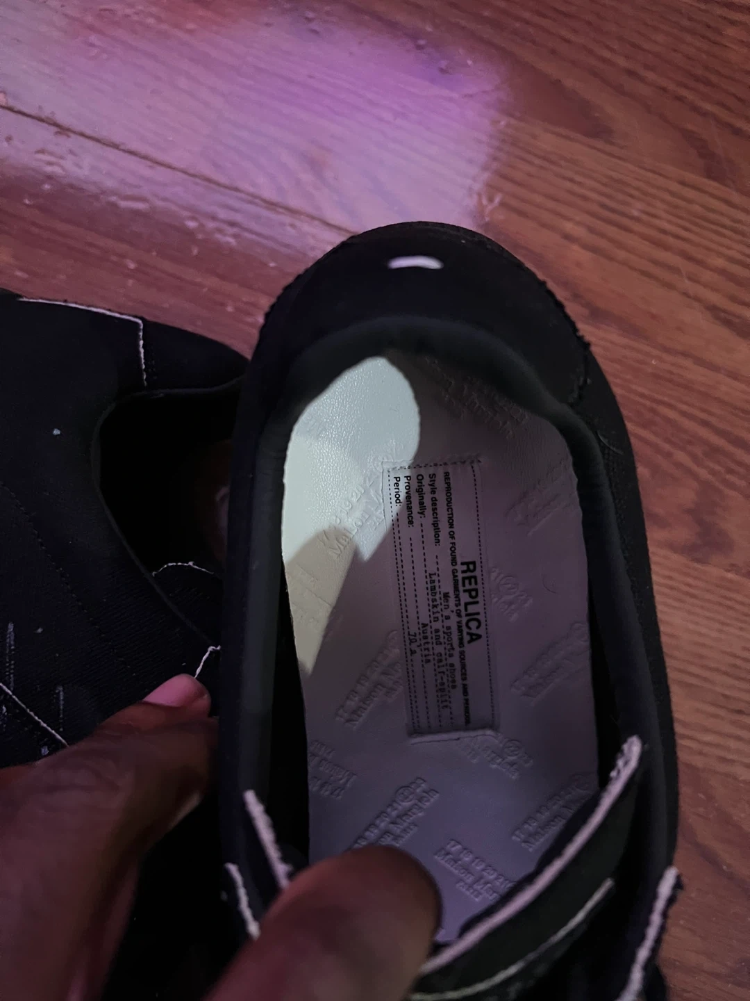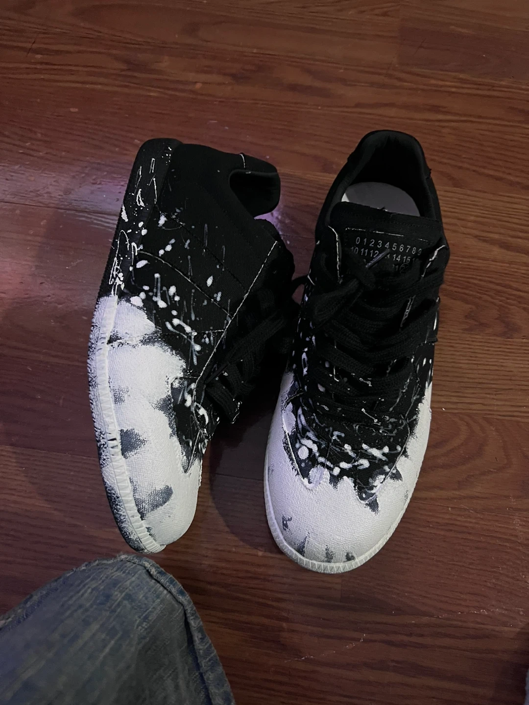 Selling a pair of Maison Margiela Replica sneakers! They are a size 11The sneakers feature a unique black and white design.