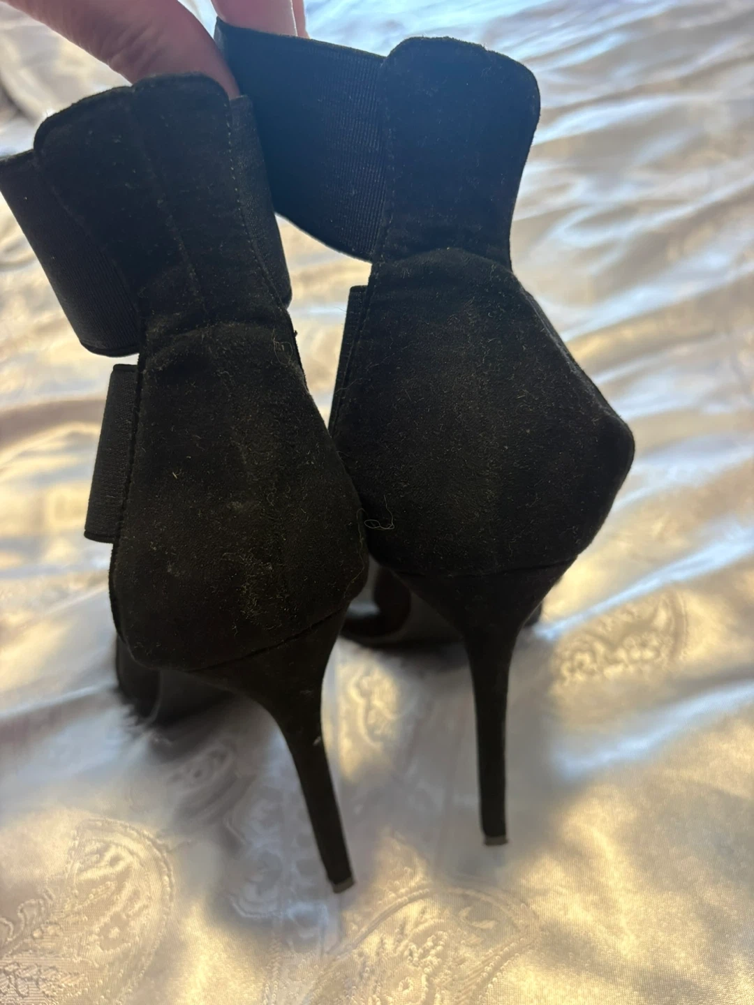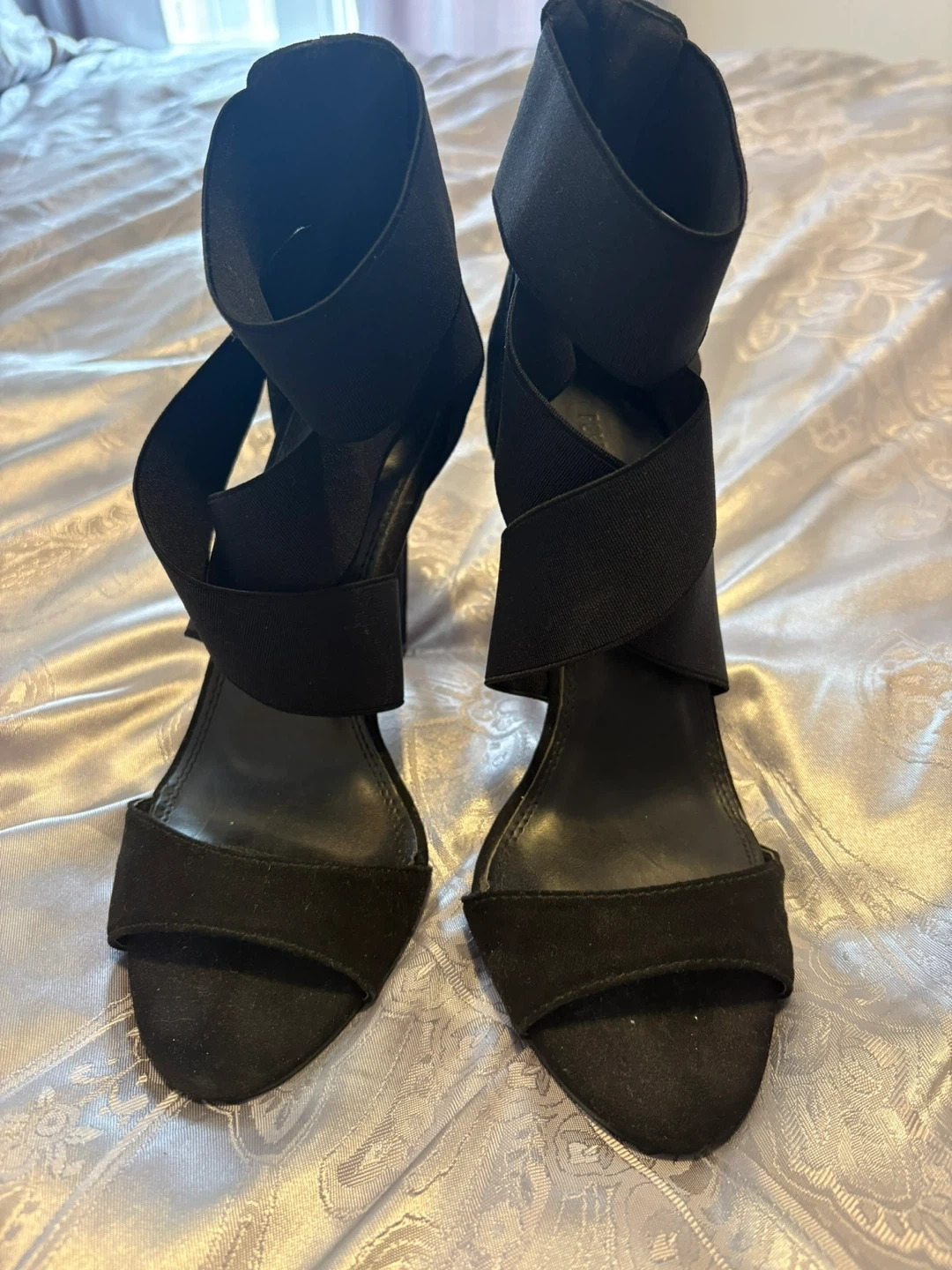 Stylish black stiletto heels with elastic straps for a secure fit. These heels feature a unique bow accent on the back. Perfect for dressing up any outfit!