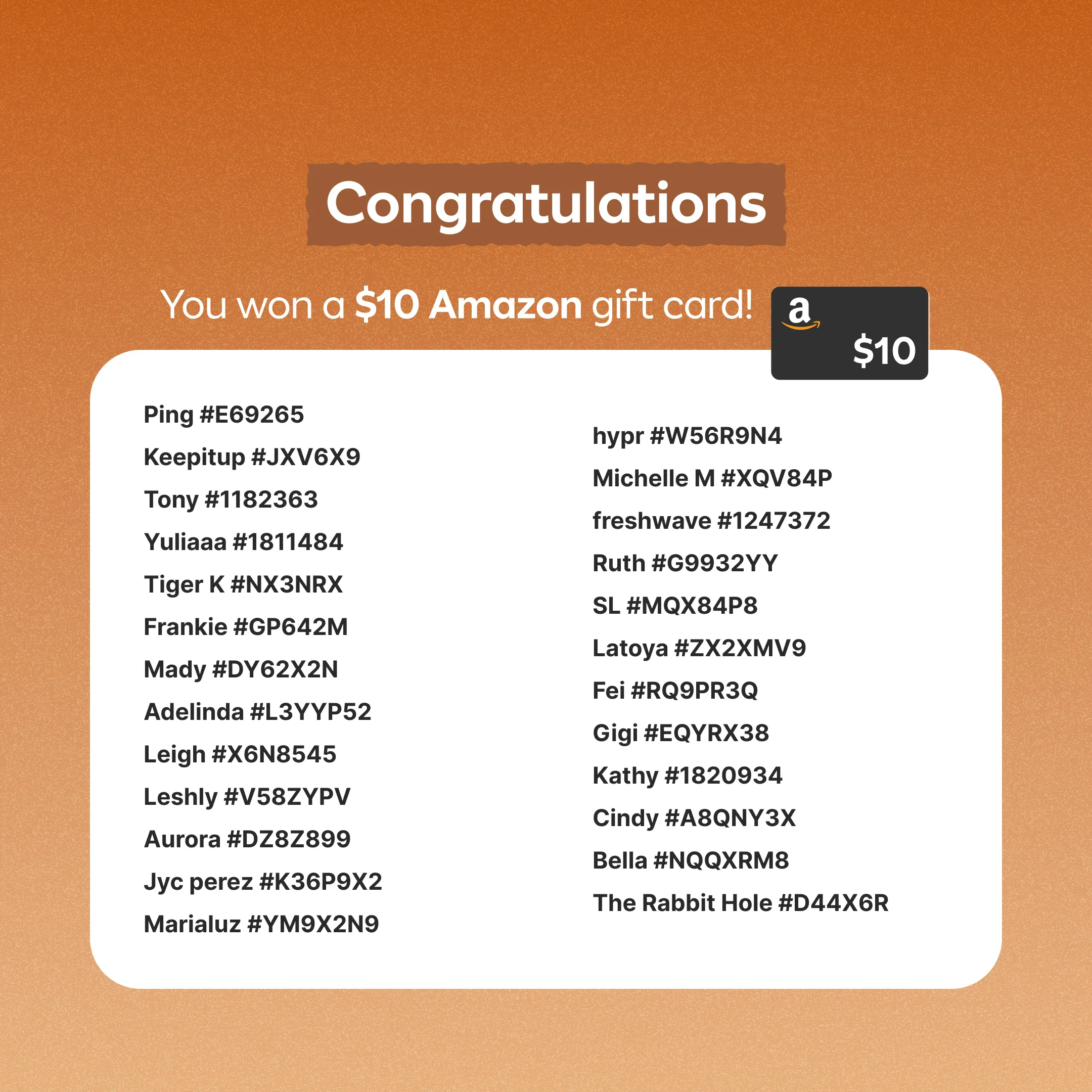 1. Amazon gift card winners - Please check your "My Rewards" section in the app. Gift cards have all been sent out!