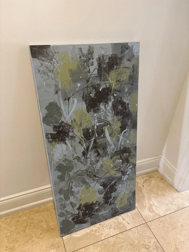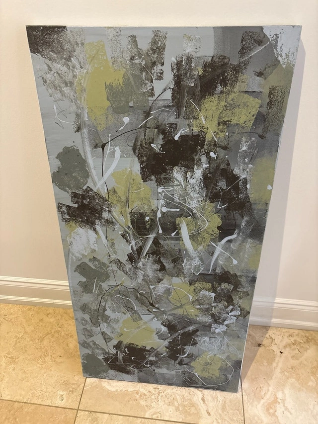 This is a unique abstract canvas, approximately 2 by 4 feet. It's in good, used condition and would be a great addition to your home or office decor. It's sure to be a conversation starter! Looking to give this canvas a new home. If the ad is up, it's still available.