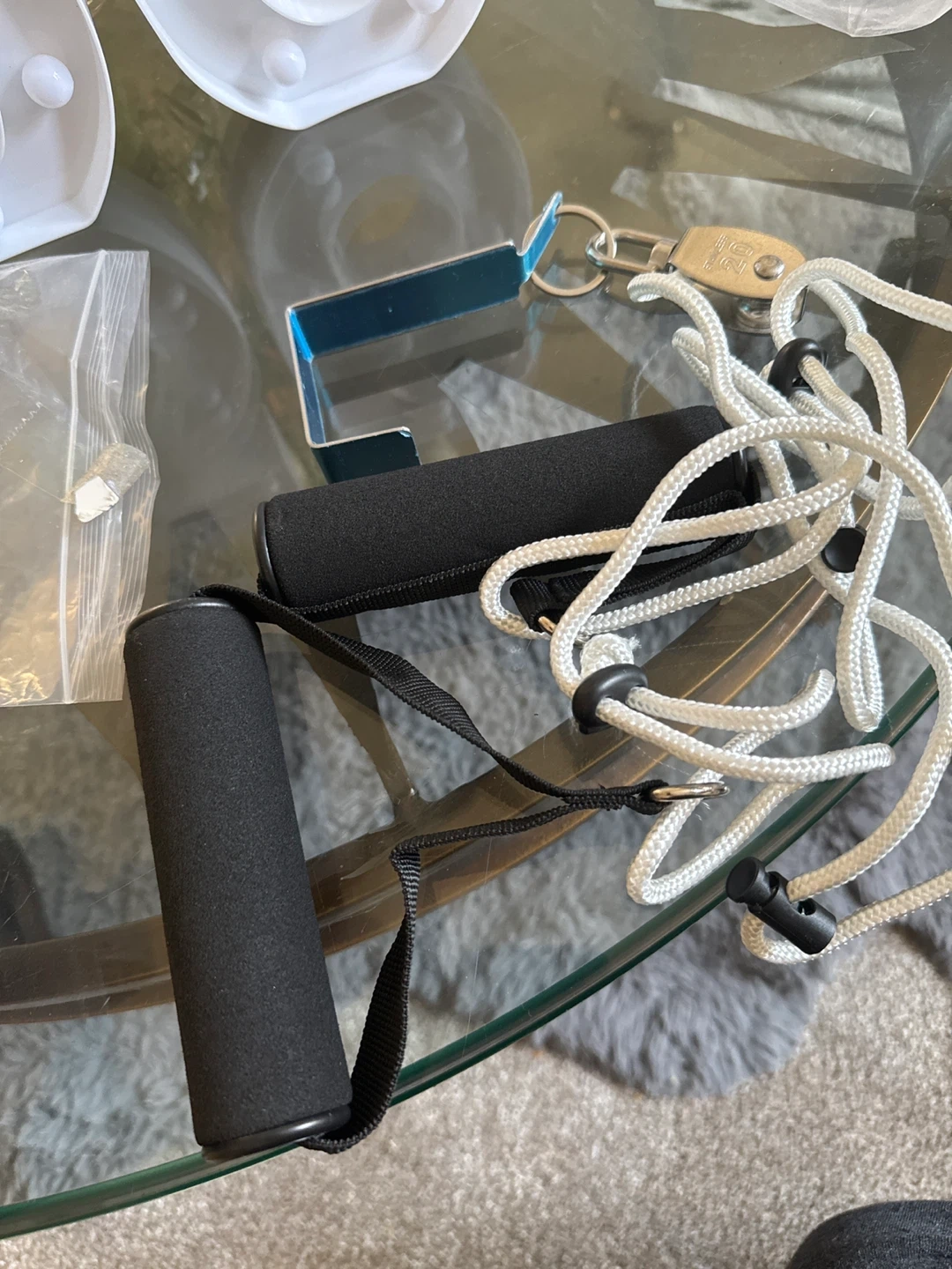 Set of two padded exercise handles with a white rope and a metal doorway attachment. These handles connect to resistance bands or pulleys for various strength training exercises. Easy to use for a home workout!