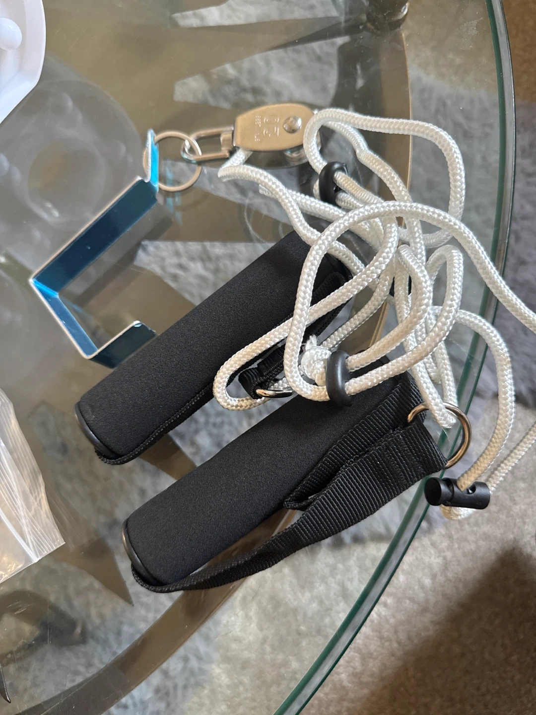 Set of two padded exercise handles with a white rope and a metal doorway attachment. These handles connect to resistance bands or pulleys for various strength training exercises. Easy to use for a home workout!