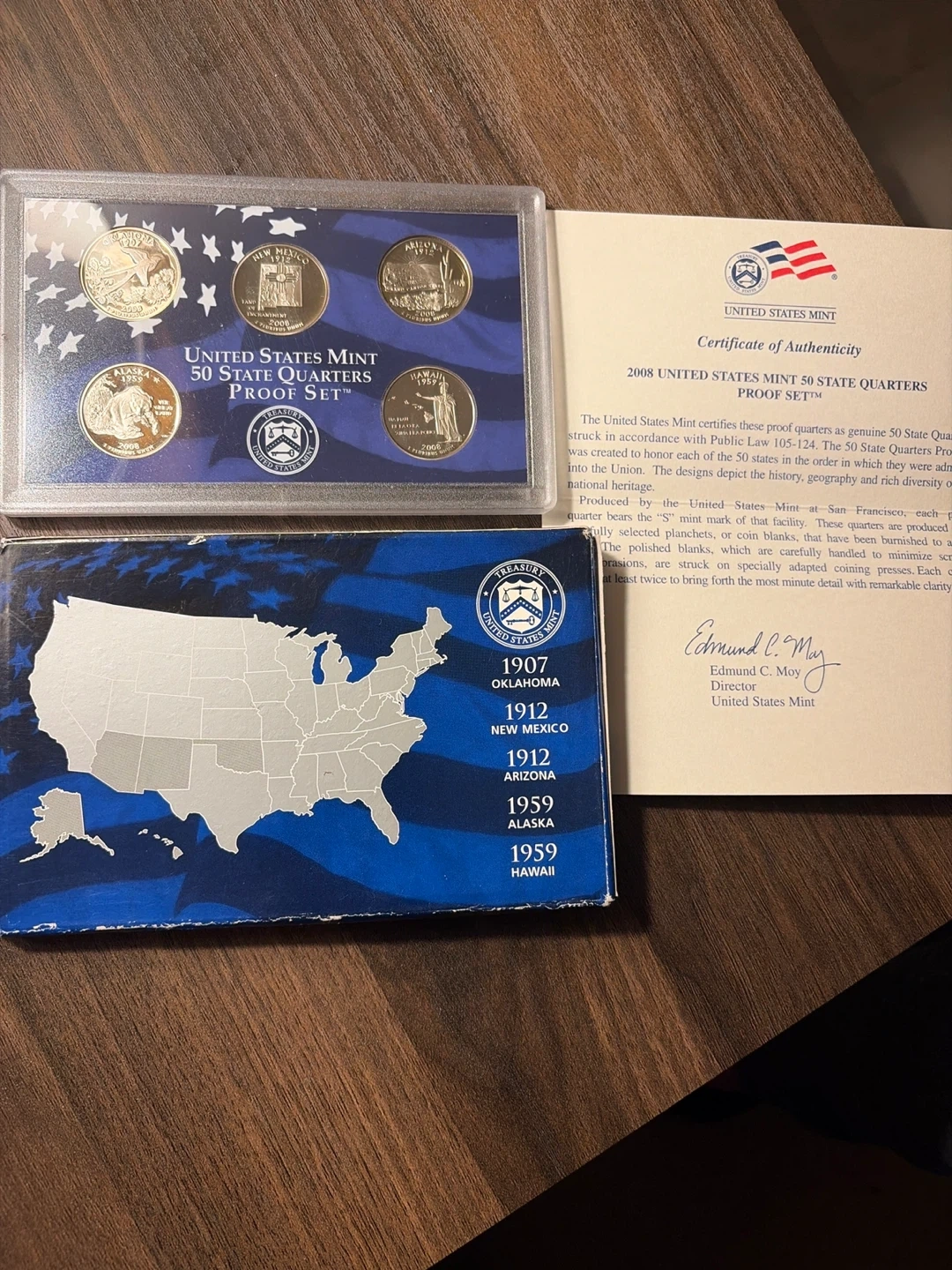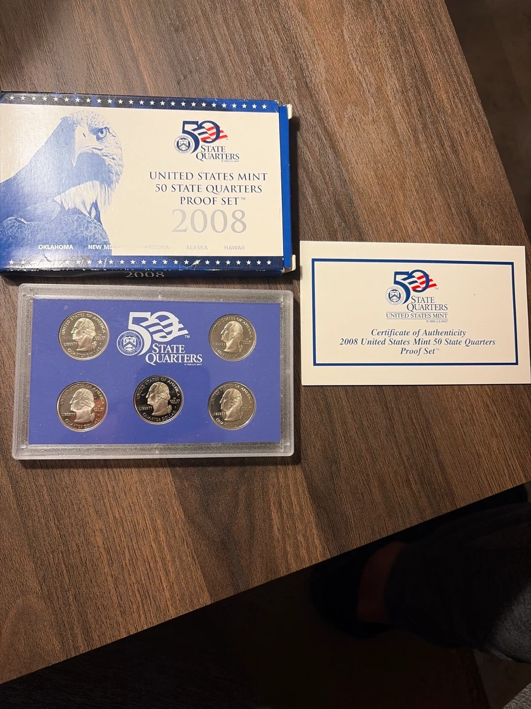 Includes the 2008 United States Mint 50 State Quarters Proof Set. This set contains five proof quarters from the United States Mint. Includes the certificate of authenticity uncirculated.