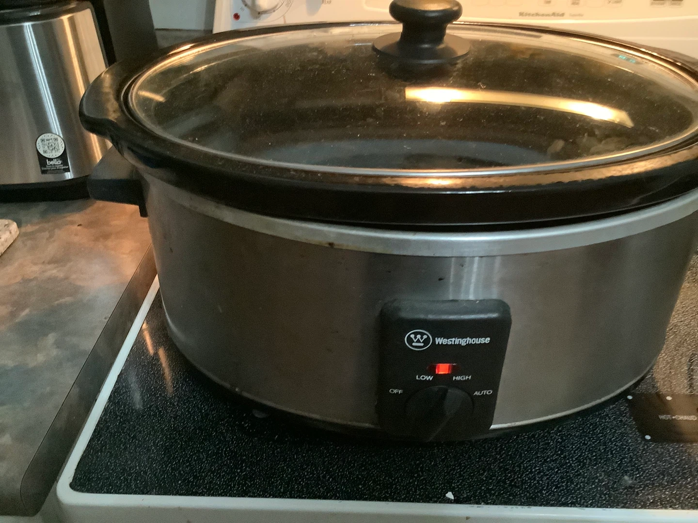 This is a Westinghouse slow cooker with settings for low, high, and auto. It has a glass lid and stainless steel exterior. Perfect for meal prepping.