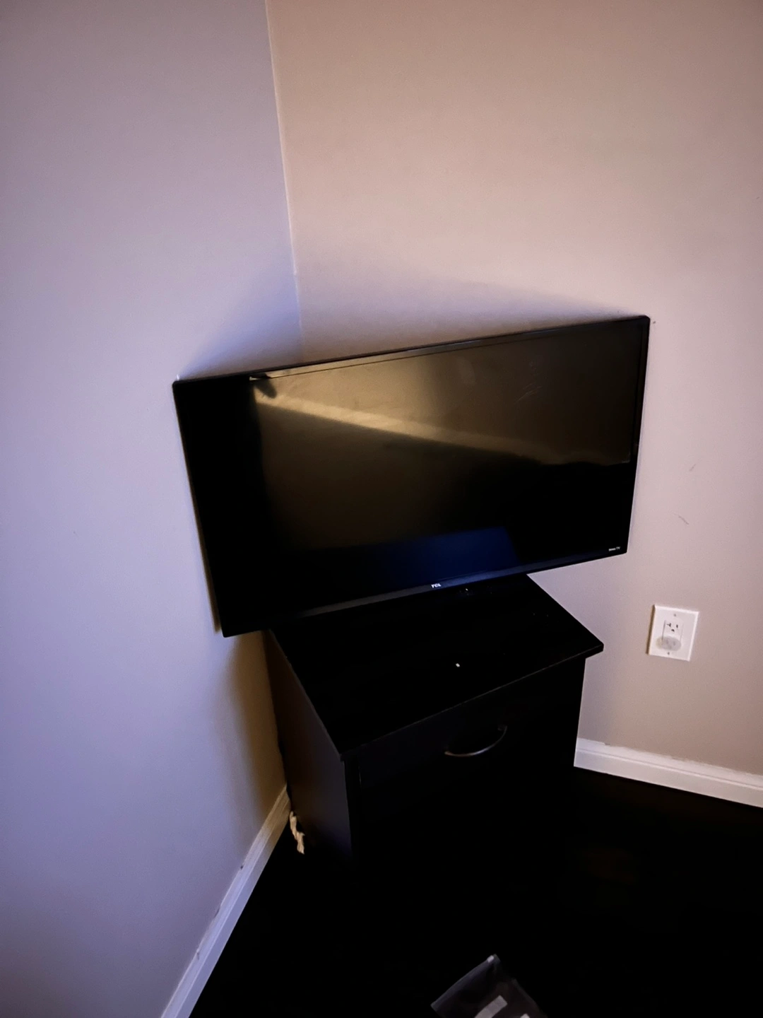 This is a TCL flat-screen TV. It's a black, modern television. It has a digital display and is suitable for a bedroom or small living space.