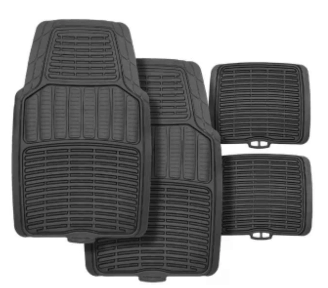 Set of four black rubber car floor mats. Includes two large front mats and two smaller rear mats. Ribbed surface for easy cleaning and traction.