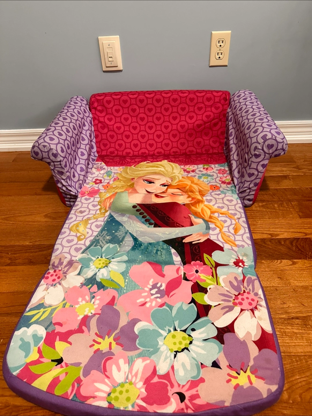 Adorable Frozen-themed sofa bed. Perfect for a child's room. Features Elsa and Anna. Folds out into a small sleeping space. Purple and pink colour scheme.