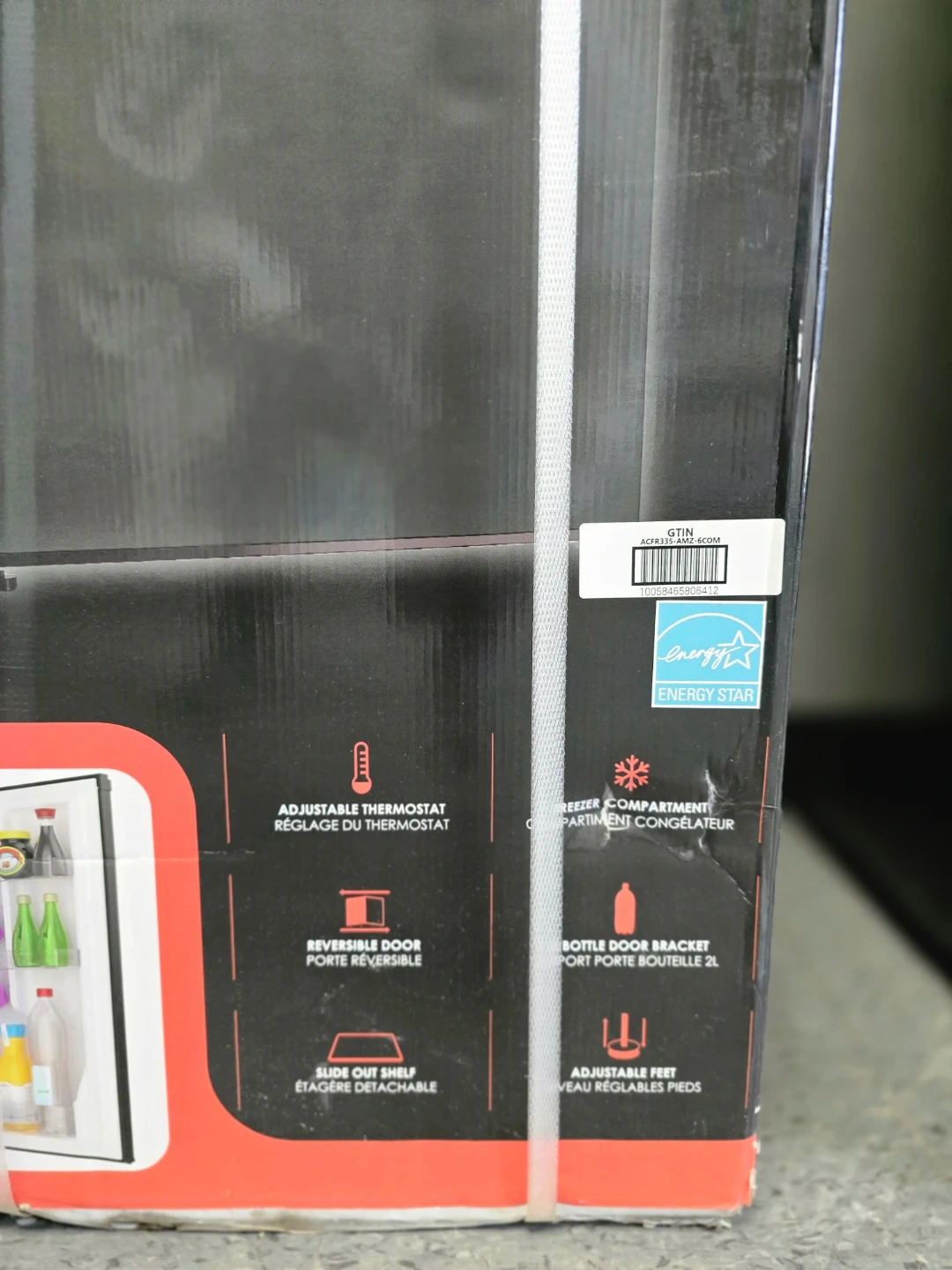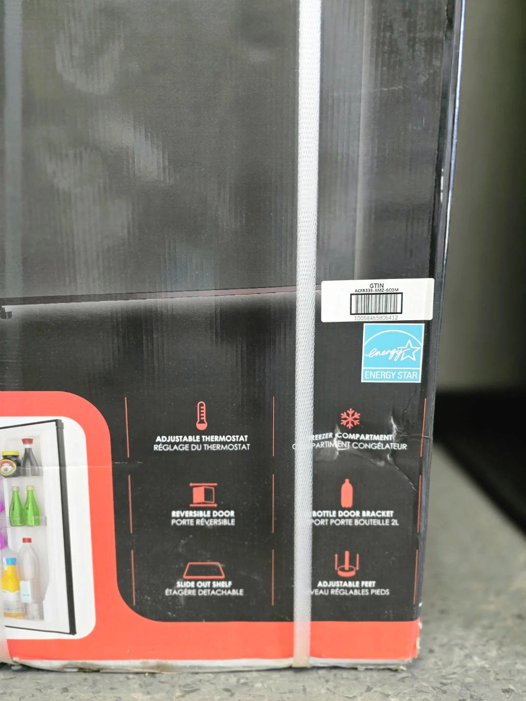 This Arctic Chef compact fridge is 3.2 cu. ft. and finished in black stainless steel. It features an adjustable thermostat and a reversible door. It also includes a slide-out shelf, bottle door bracket, and adjustable feet.