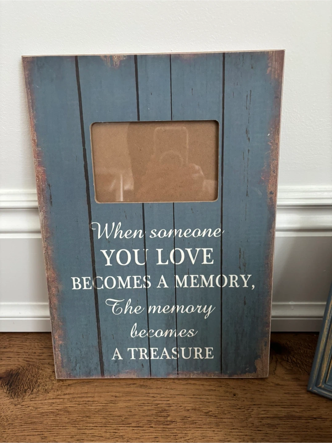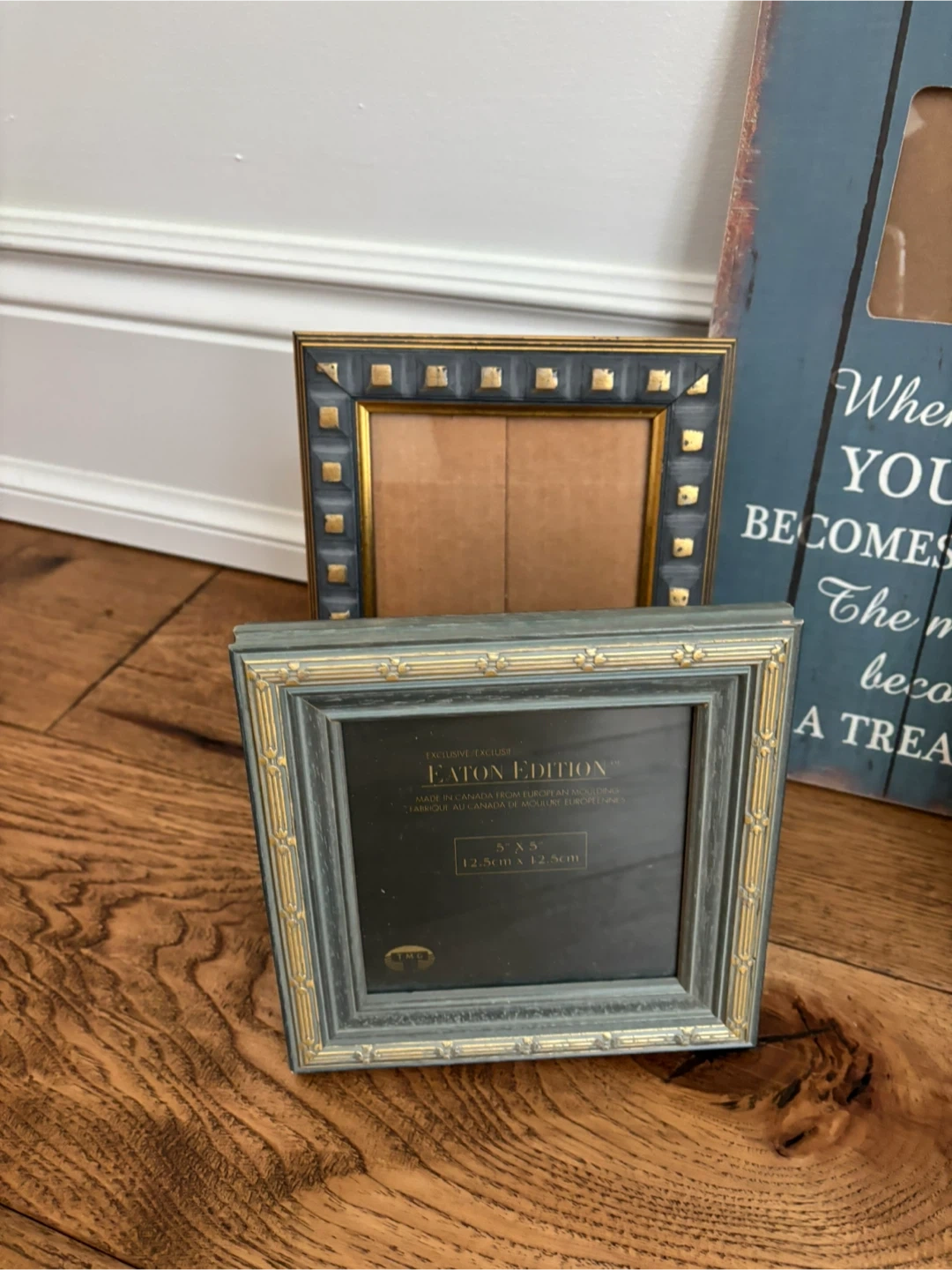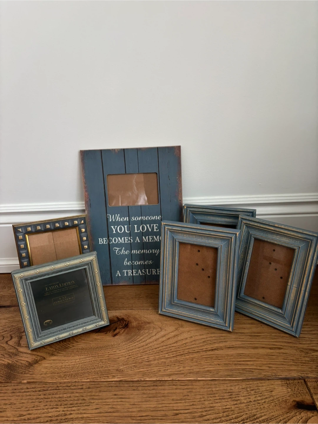 A collection of decorative photo frames in various styles and sizes. One frame features the quote 'When someone you love becomes a memory, the memory becomes a treasure.' Another is a 5x5 inch frame from Eaton Edition, made in Canada from European moulding.
