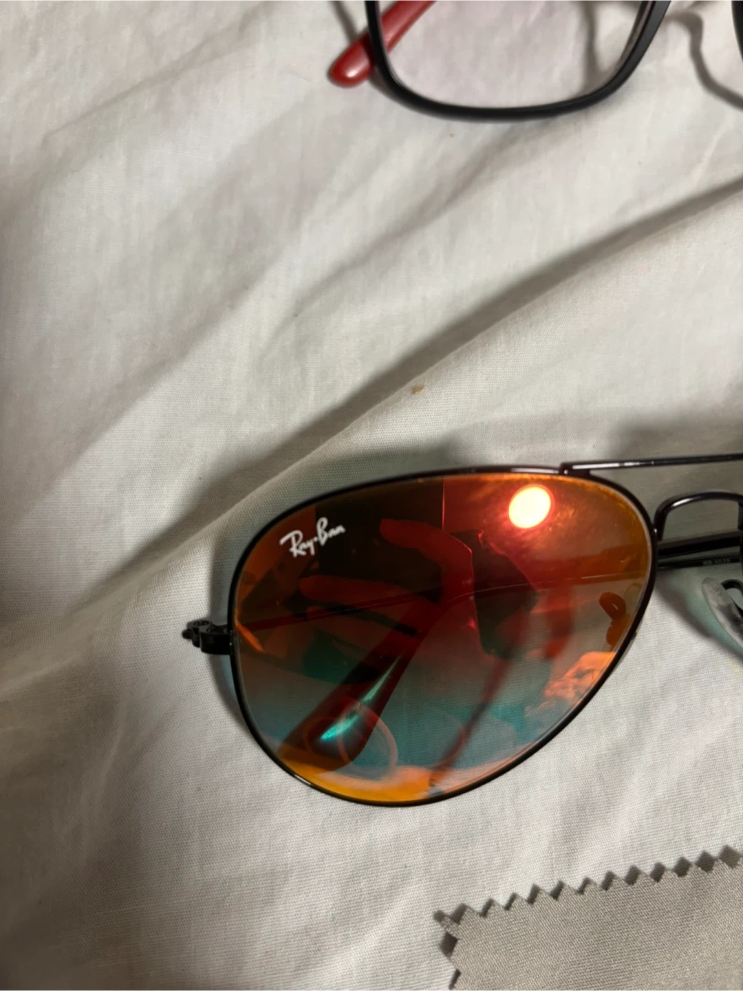 Ray-Ban aviator sunglasses in black with red mirrored. Includes a brown leatherette case and a grey microfiber cleaning cloth. Perfect for sunny days!
