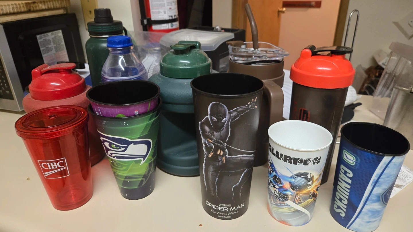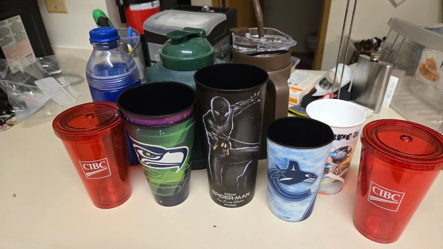 Set of reusable tumblers featuring Spider-Man, Vancouver Canucks, and Seattle Seahawks designs. Includes two red CIBC branded tumblers. Durable plastic construction for everyday use.