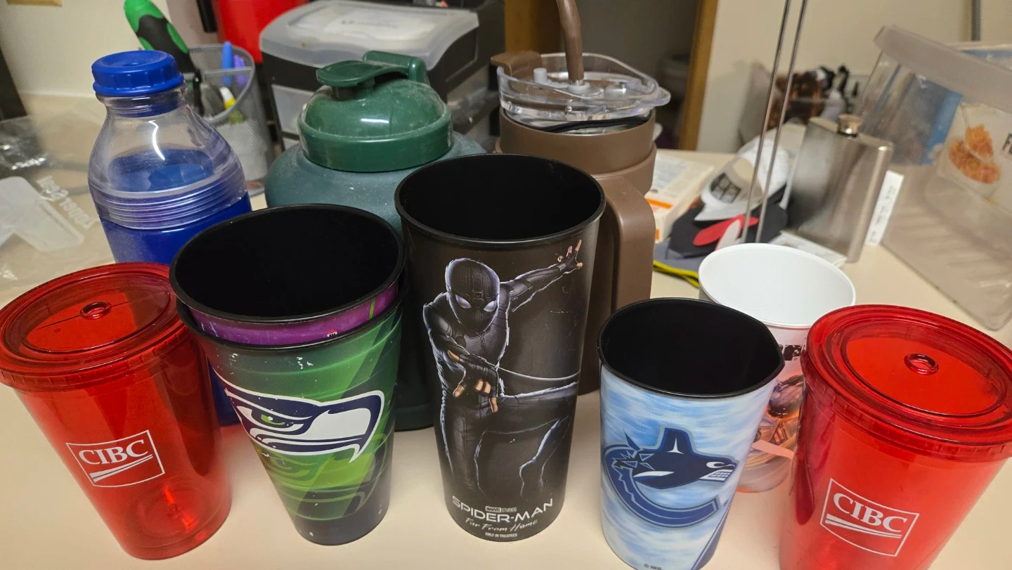 Set of reusable tumblers featuring Spider-Man, Vancouver Canucks, and Seattle Seahawks designs. Includes two red CIBC branded tumblers. Durable plastic construction for everyday use.