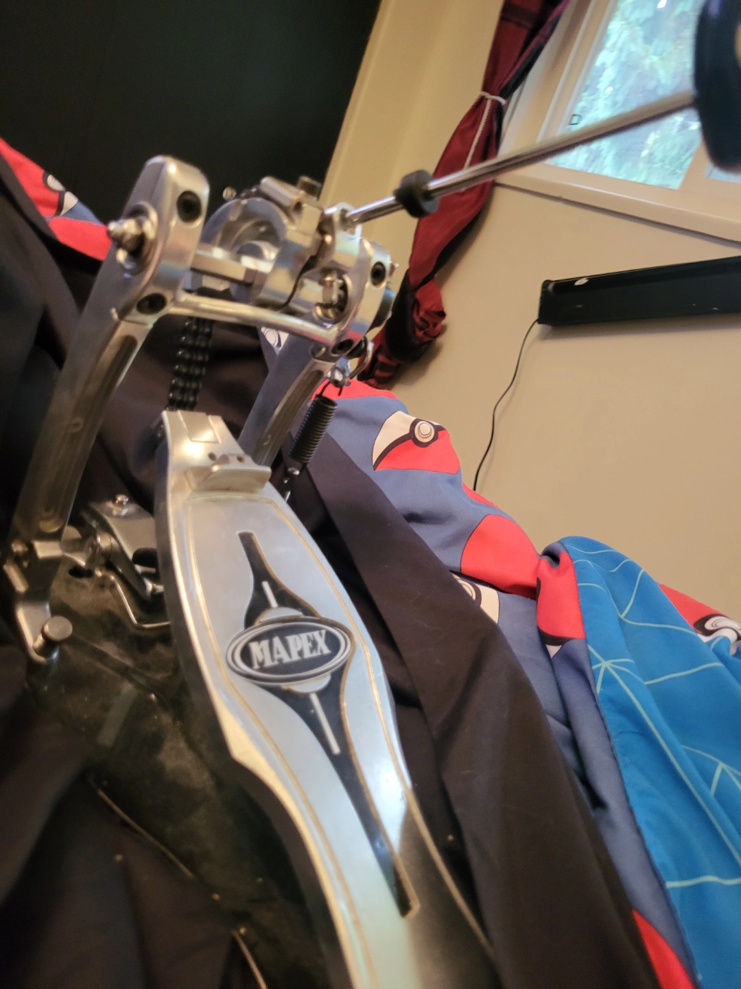 Drum pedal, likely a bass drum pedal. Featuring a metal construction. The foot plate has a sleek design. A great way to practice drumming for hours on end.
