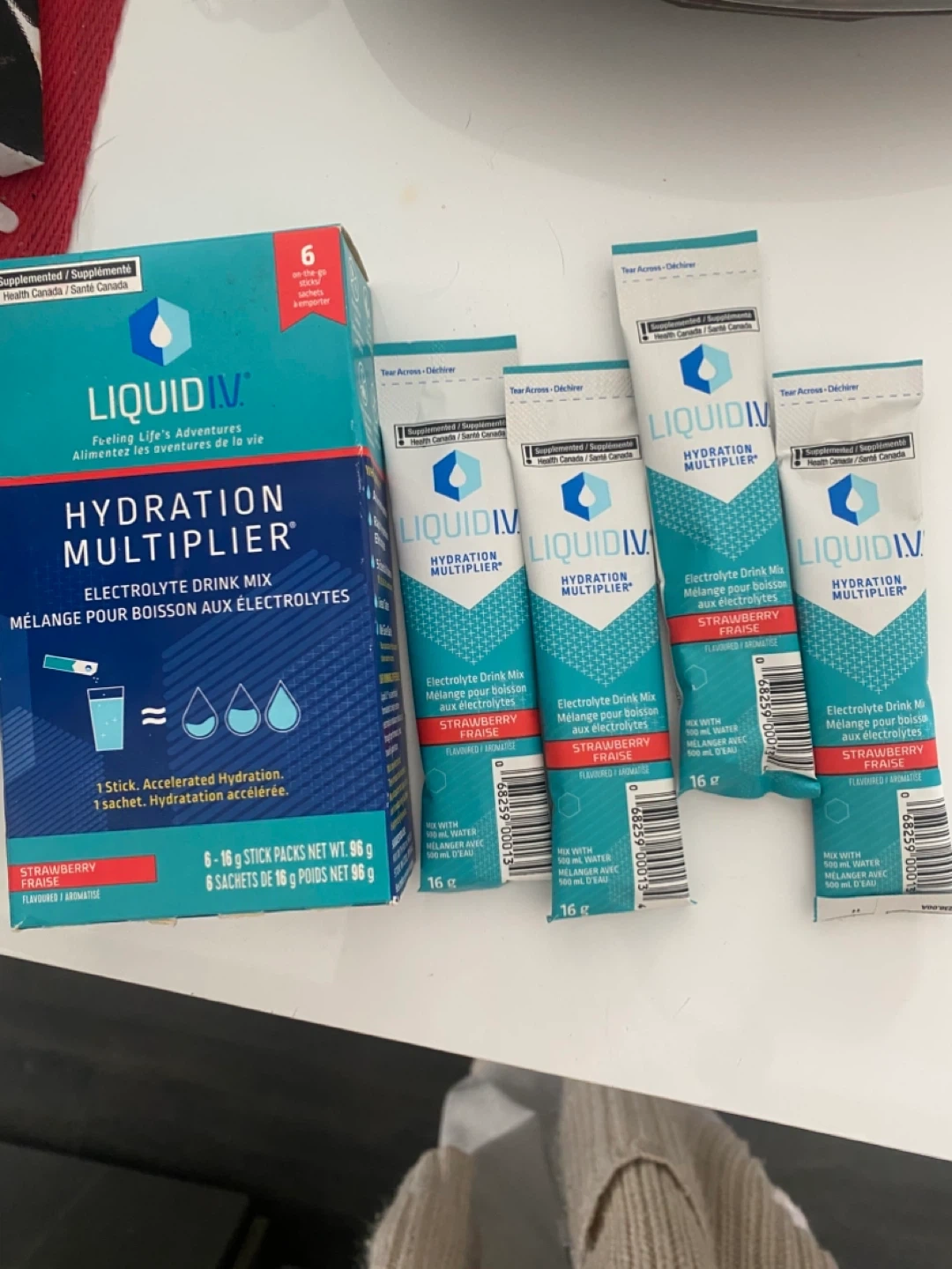 This is a box of strawberry flavoured Liquid IV Hydration Multiplier drink mix containing 4 unopened, single serve 16g packages. The product is gluten-free and non-GMO. Best before date is 2026 April 10.