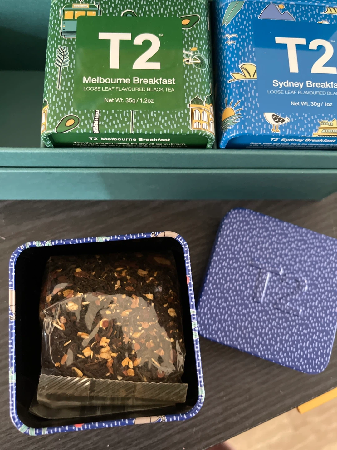 Selling a T2 tea gift set including three delicious breakfast blends: Melbourne Breakfast (35g/1.2oz), Sydney Breakfast (30g/1oz), and Canberra Breakfast (40g/1.4oz)