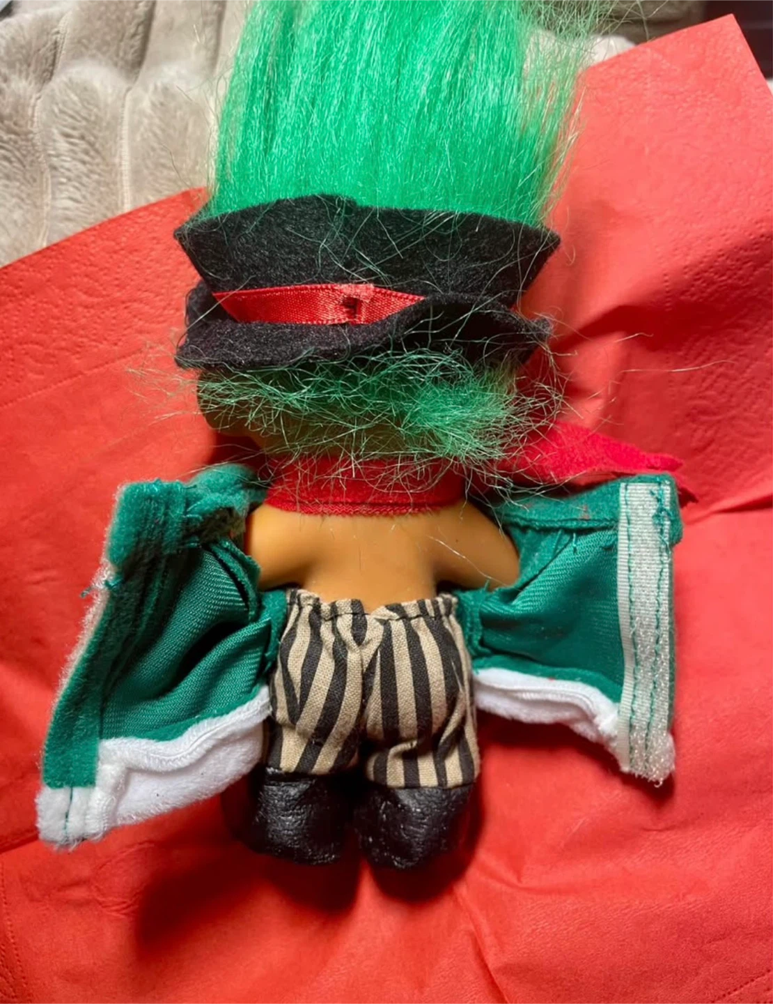 Approximately 5" high in good condition. Has green coat with velcro and elastic waistband pants with black boots which are removable. Circa 1990s when the troll doll craze was at its height.