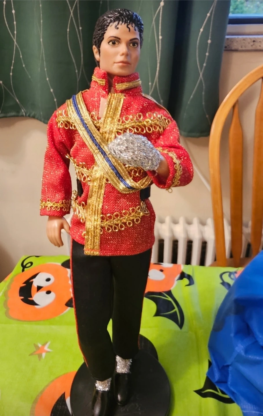 This doll is a Michael Jackson tribute, dressed in his iconic red Thriller jacket and black pants. It comes with a sparkly glove and matching shoe accents. Great for fans of the King of Pop!