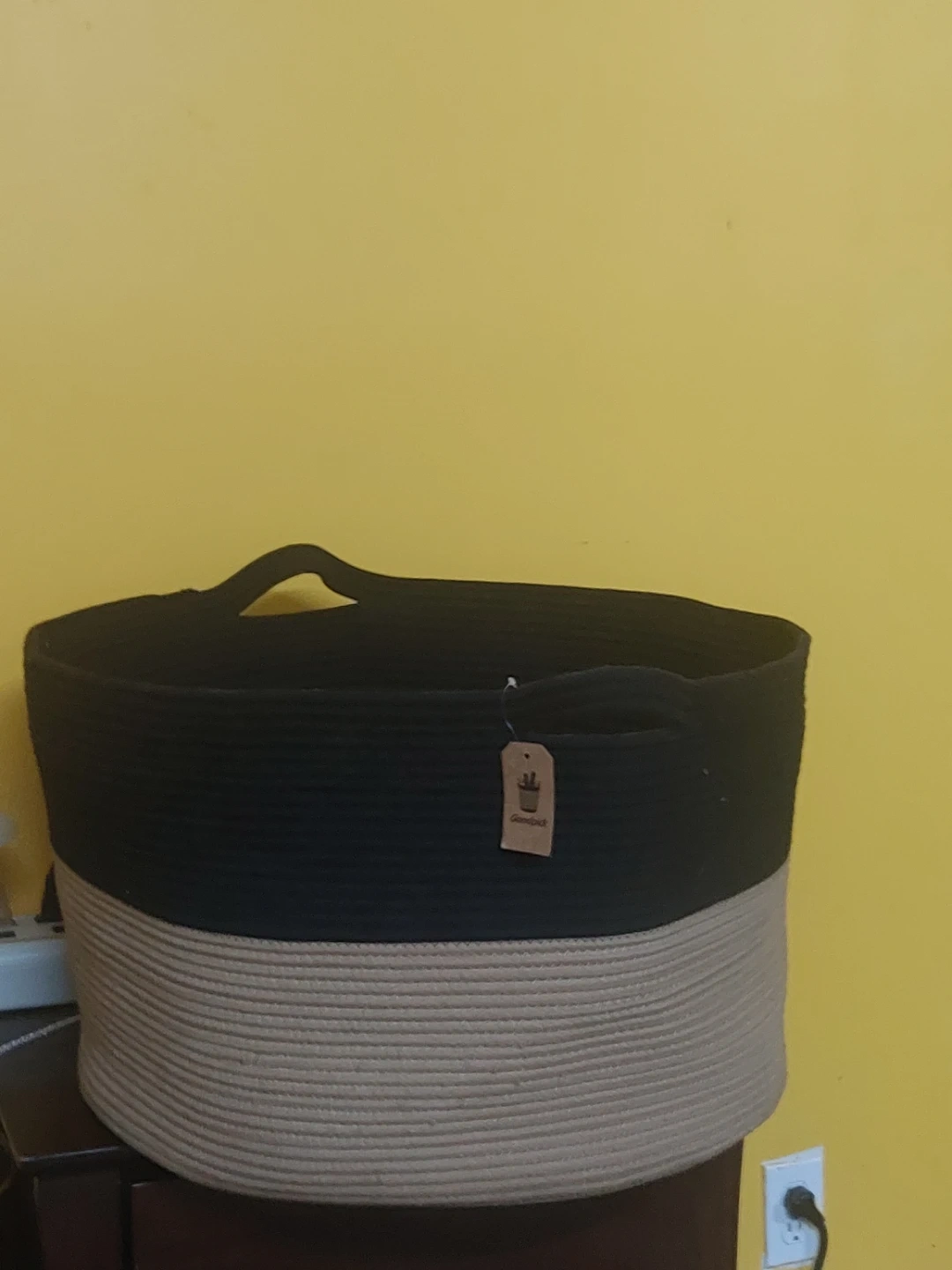 This new woven rope basket features a two-tone design in black and tan. It's made from sturdy rope and includes handles for easy carrying. It's a practical solution for organizing various items in your home.
