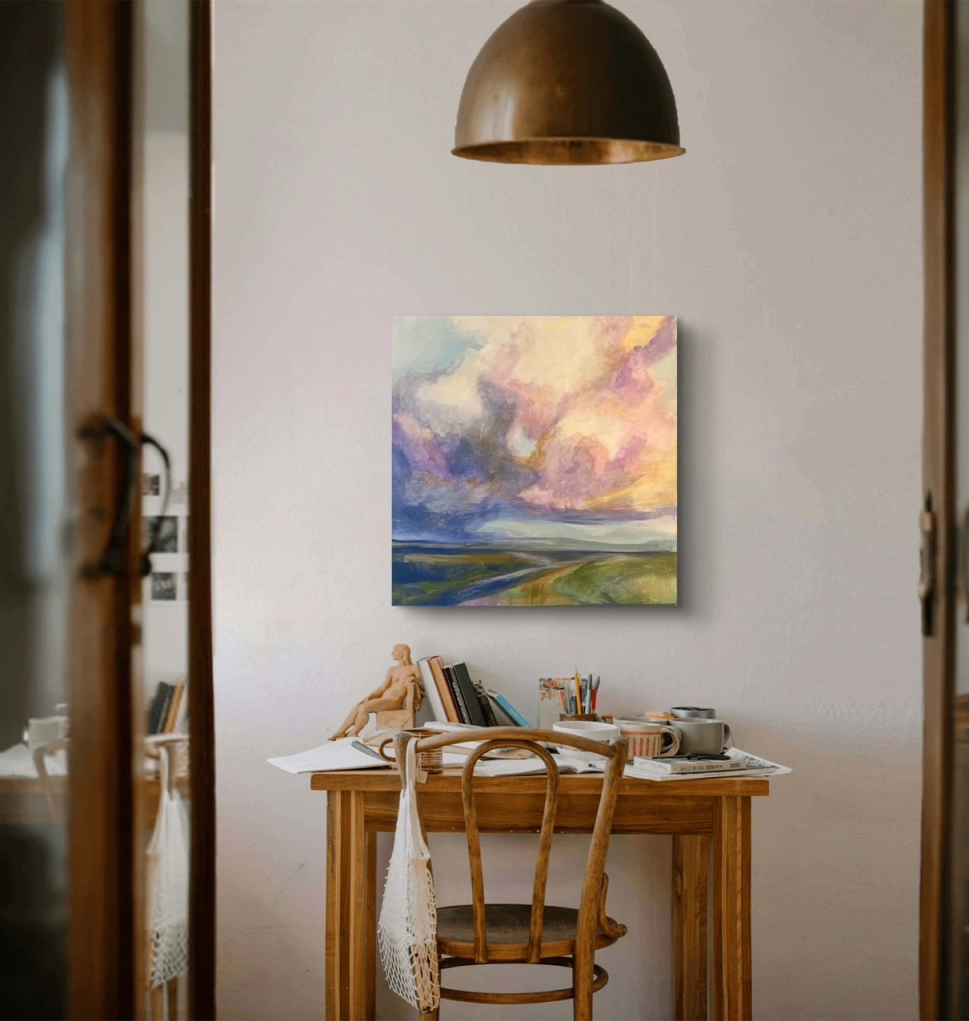 Vibrant abstract landscape painting. This canvas art features a colourful sky over rolling hills. It's a beautiful piece for any room! Real painting not a print