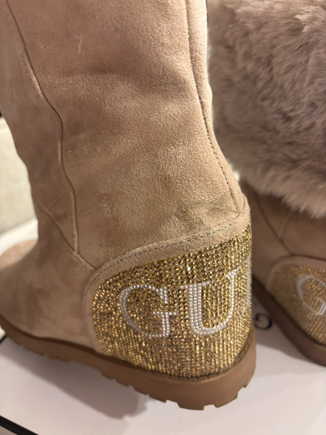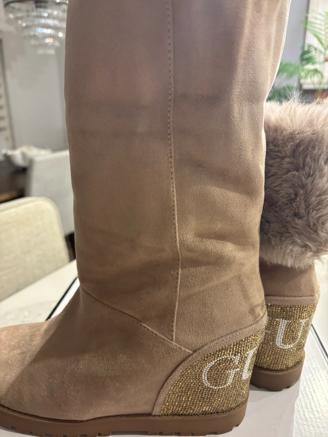 These Guess boots are perfect for adding a touch of glam to your winter wardrobe! They feature a soft beige suede exterior, a cozy faux fur trim, and a sparkly 'GUESS' logo on the back. They're in great condition and ready for cold weather. Worn once almost new
